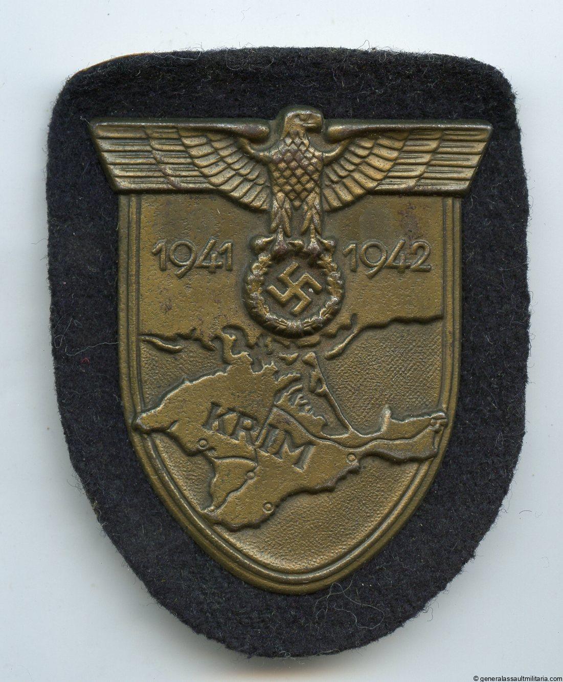Krim shield Panzer/Kriegsmarine cloth – Karl Wurster, Markneukirchen. Steel 4 prong Krim shield with paper backing and blue/black cloth. Remains in unworn condition with a few small rust spots and nearly all the bronze finish nicely preserved. Wurster design shield with very rare blue/black colored cloth. Top shield that is very difficult to find.