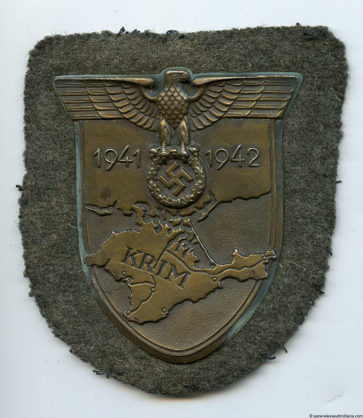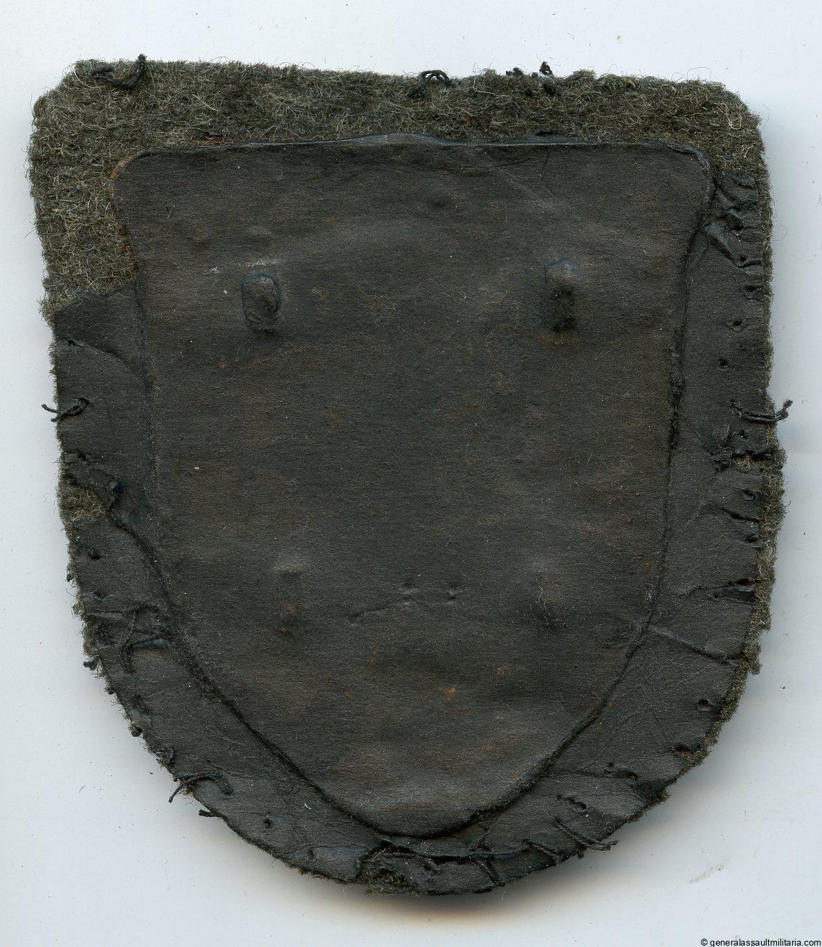 Krim shield – unknown maker. Steel construction Heer green cloth Krim with bronze finish and backing paper. Remains in uniform removed condition and still shows some of the stitching on the reverse. Retained nearly all the bronze finish with slight oxidation on the edges. Most of the backing paper is still present and has all 4 prongs intact.