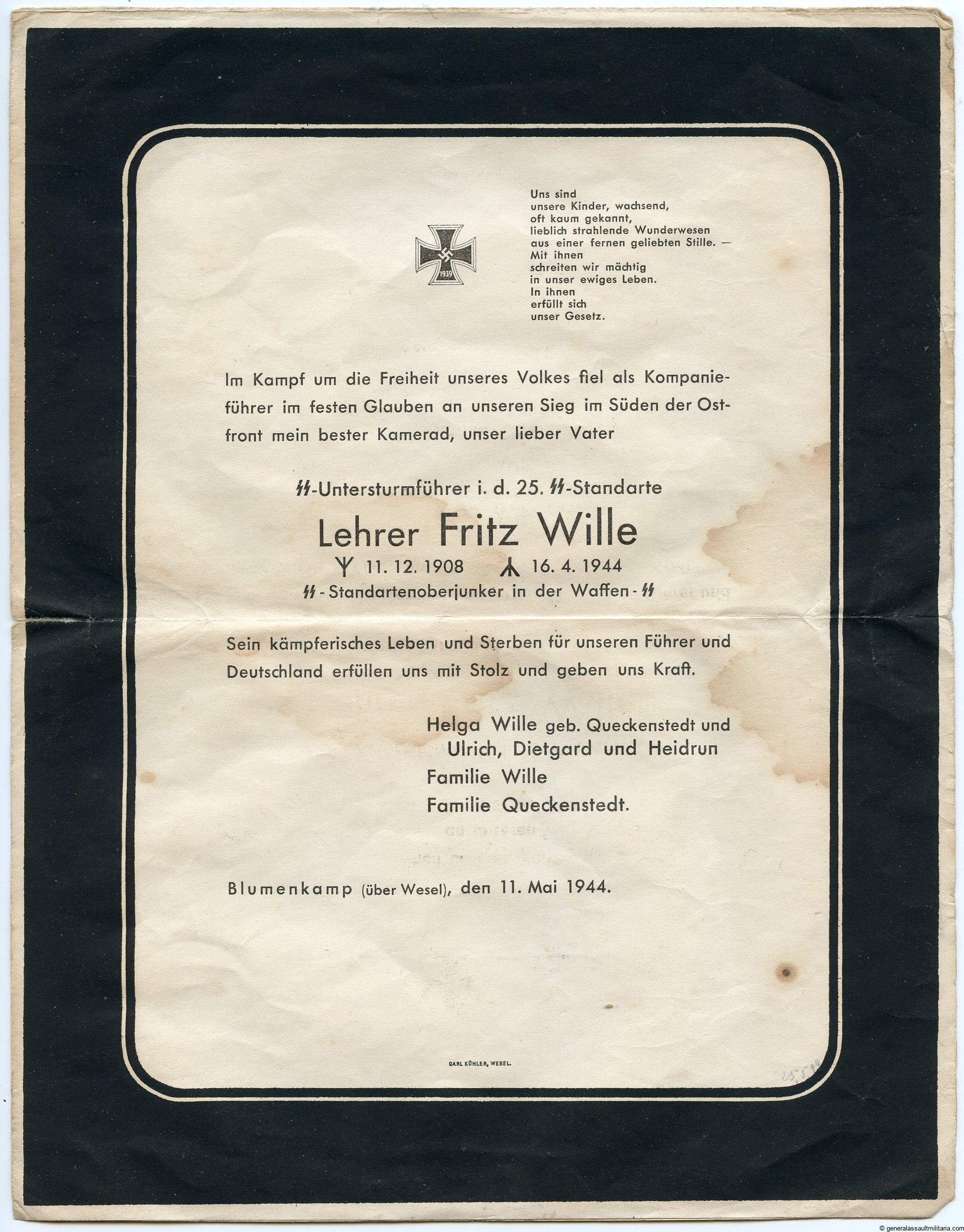 Large death notice letter to Lehrer Fritz Wille, Untersturmführer SS Standarte 25. Remains in good condition with some signs of age. Shows the address and postal stamp on the other side and was vaulted up to be shipped as a letter to acquaintances. Wille was a member of the 25th SS Standarte and was KIA on the eastern front.