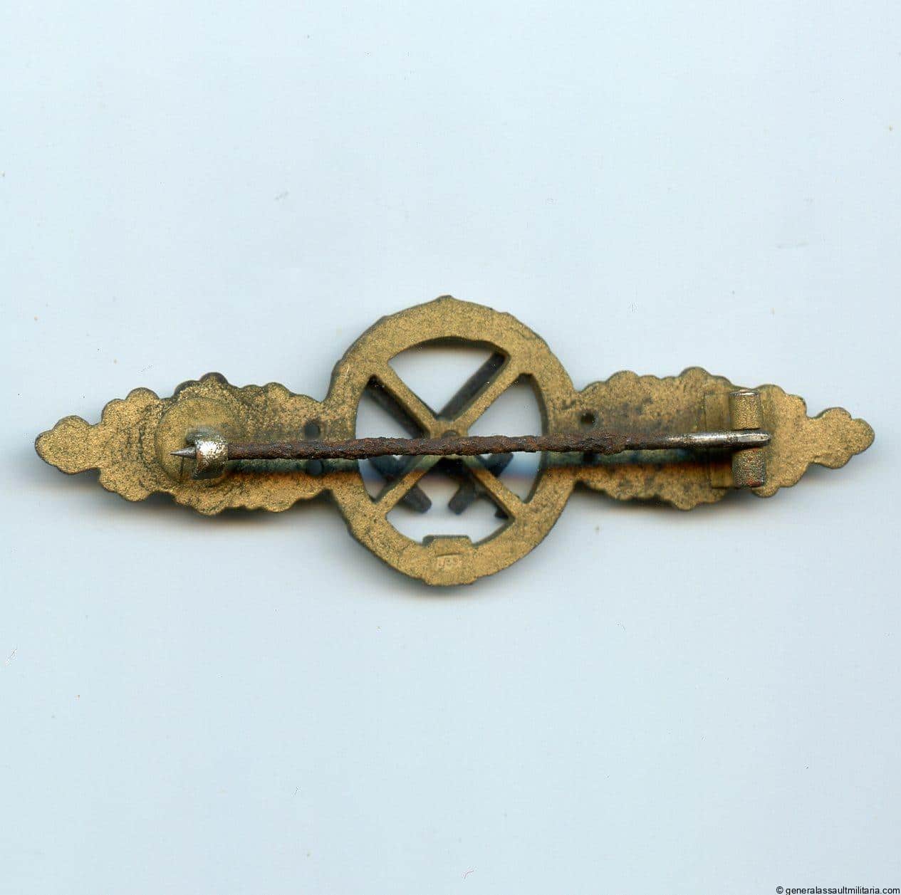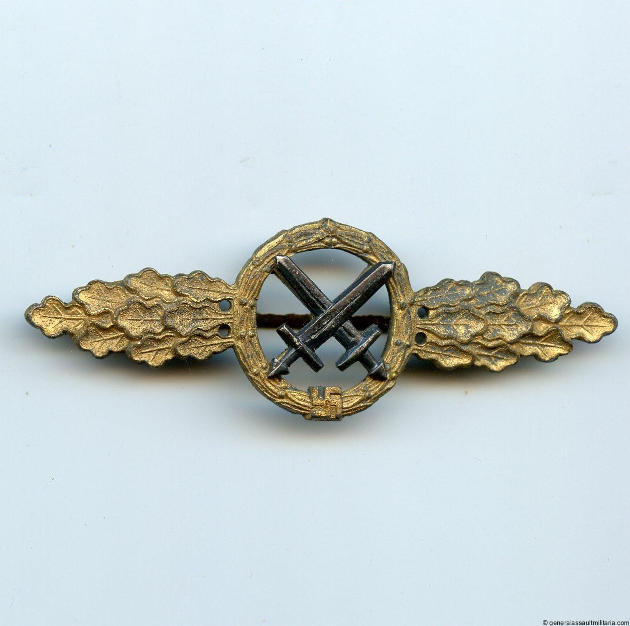 Luftwaffe air to ground clasp in gold – Rudolf Souval, Wien. Early post war zinc construction clasp with riveted swords and gold finish. Remains in very good condition with nearly all the finish still present and a rusted pin from storage. Rare Souval badge.