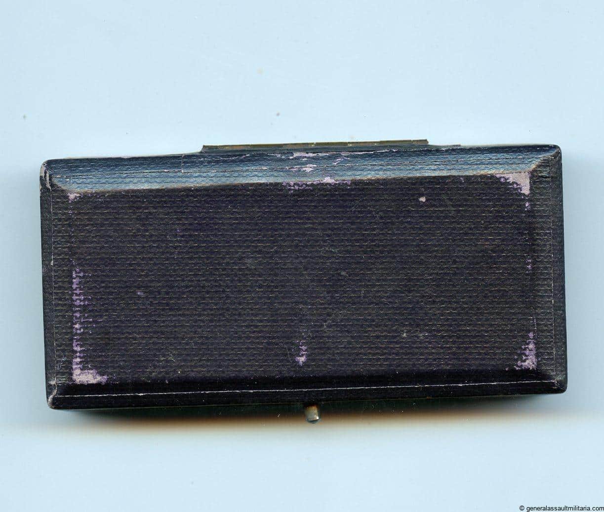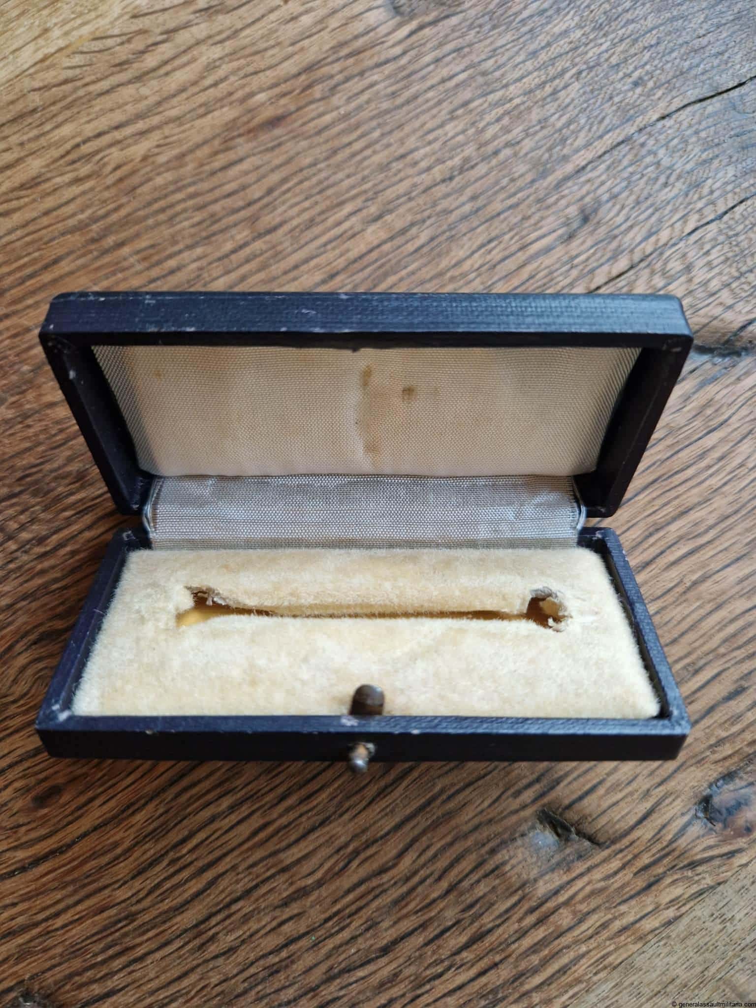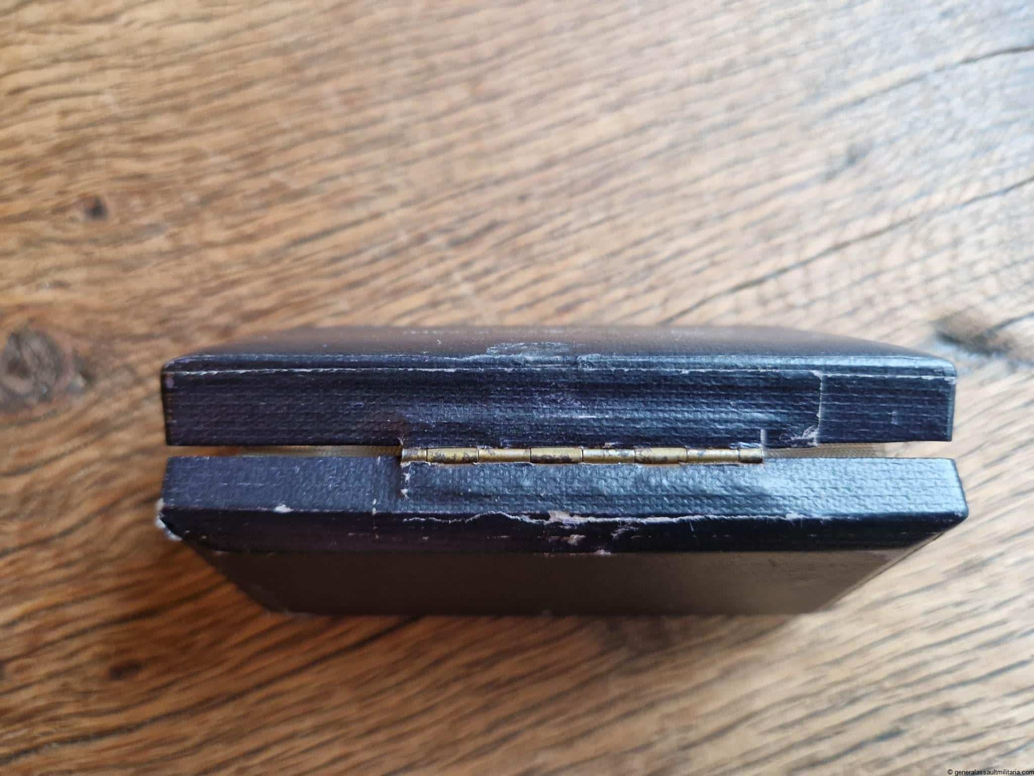Luftwaffe bomber clasp in gold case – generic. Case for the early tombac bomber clasp in gold with blue outside and gold lettering. Remains in very good condition with only light discoloration to the lettering and light wear on the bottom and top. A case that is often missing with the gold clasp.