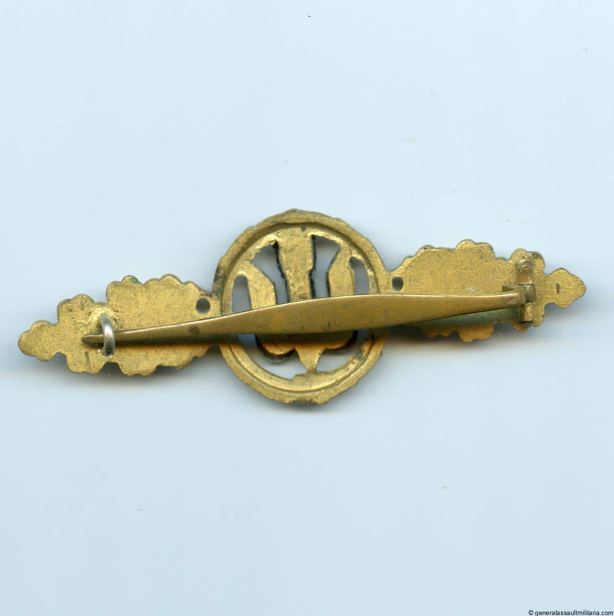 Luftwaffe bomber clasp in gold – Friedrich Linden, Lüdenscheid. Early war tombac clasp with bright gold finish and gold finished arrow device. Remains in unworn condition with mint gold finish on the clasp itself and some oxidation to the arrow device, probably due to storage. Very rare clasp, especially with this much gold finish remaining.