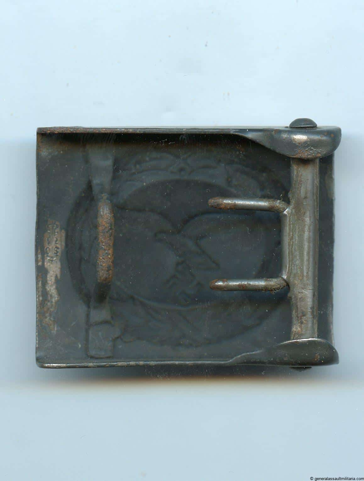 Luftwaffe buckle – Dransfeld & Co, Menden. Steel buckle with Dransfeld 1940 makers mark on the back and the original tab missing. Remains in lightly worn or used condition and shows some surface rust were the paint has worn down. Still nearly fully finished with some more rust on the catch. Quality marked Steel buckle.