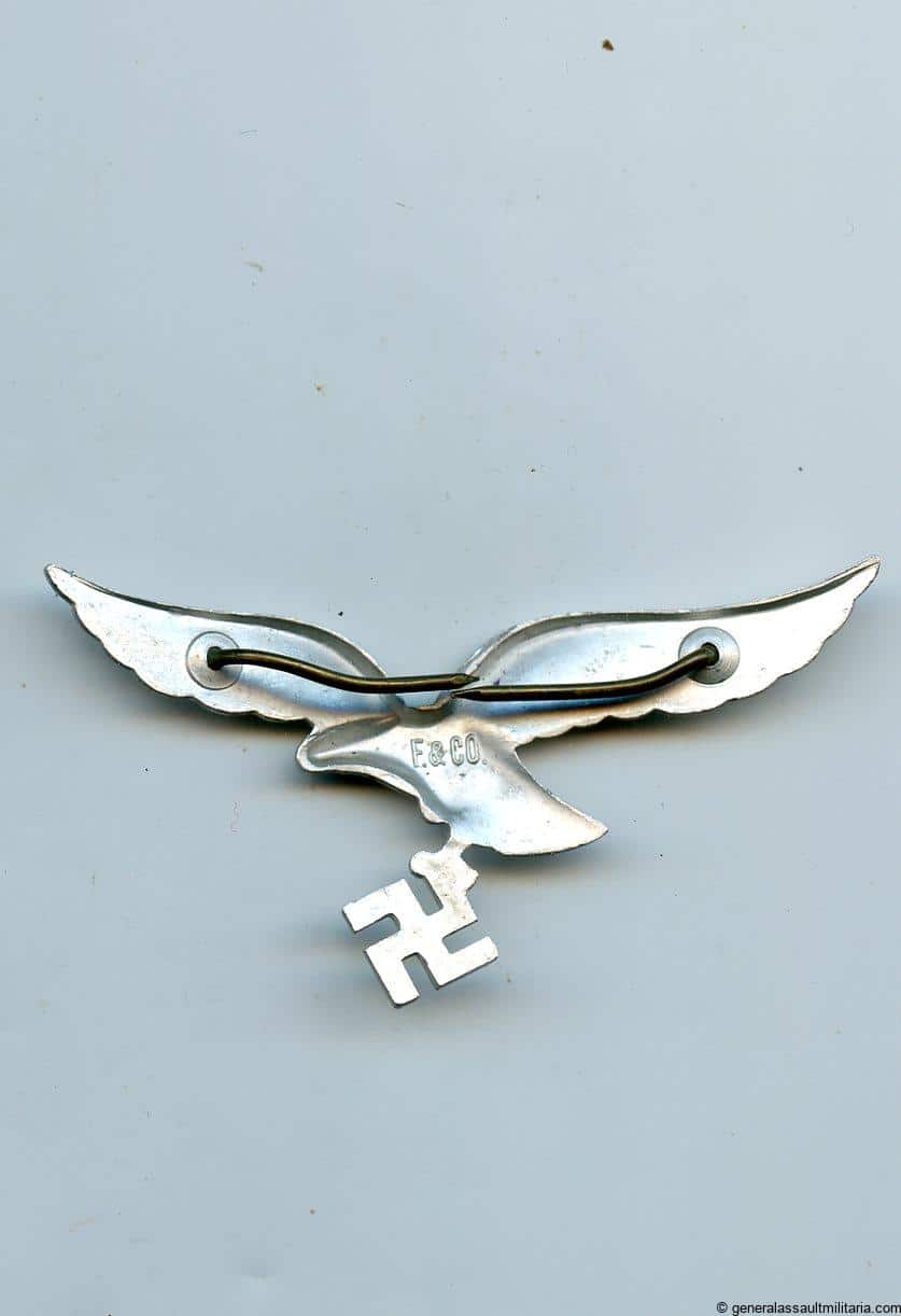 Luftwaffe cap eagle – Dr. Franke & Co, Lüdenscheid. Aluminum cap eagle with crimped in prongs and F&Co makers mark. Remains in unworn condition.