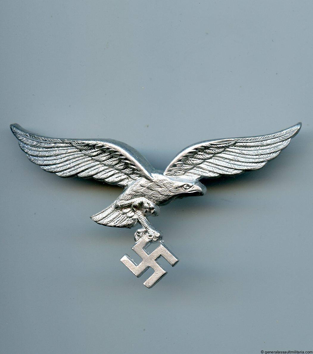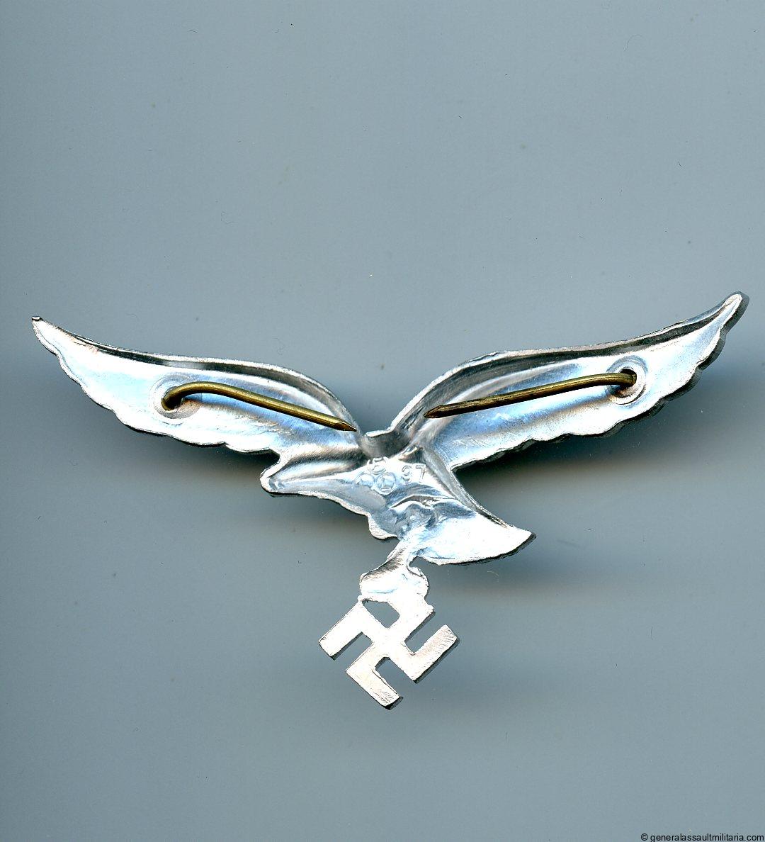 Luftwaffe cap eagle – Friedrich Linden, Lüdenscheid. Aluminum Luftwaffe cap eagle with crimped in prongs and FLL makers mark. Remains in mint unworn condition.