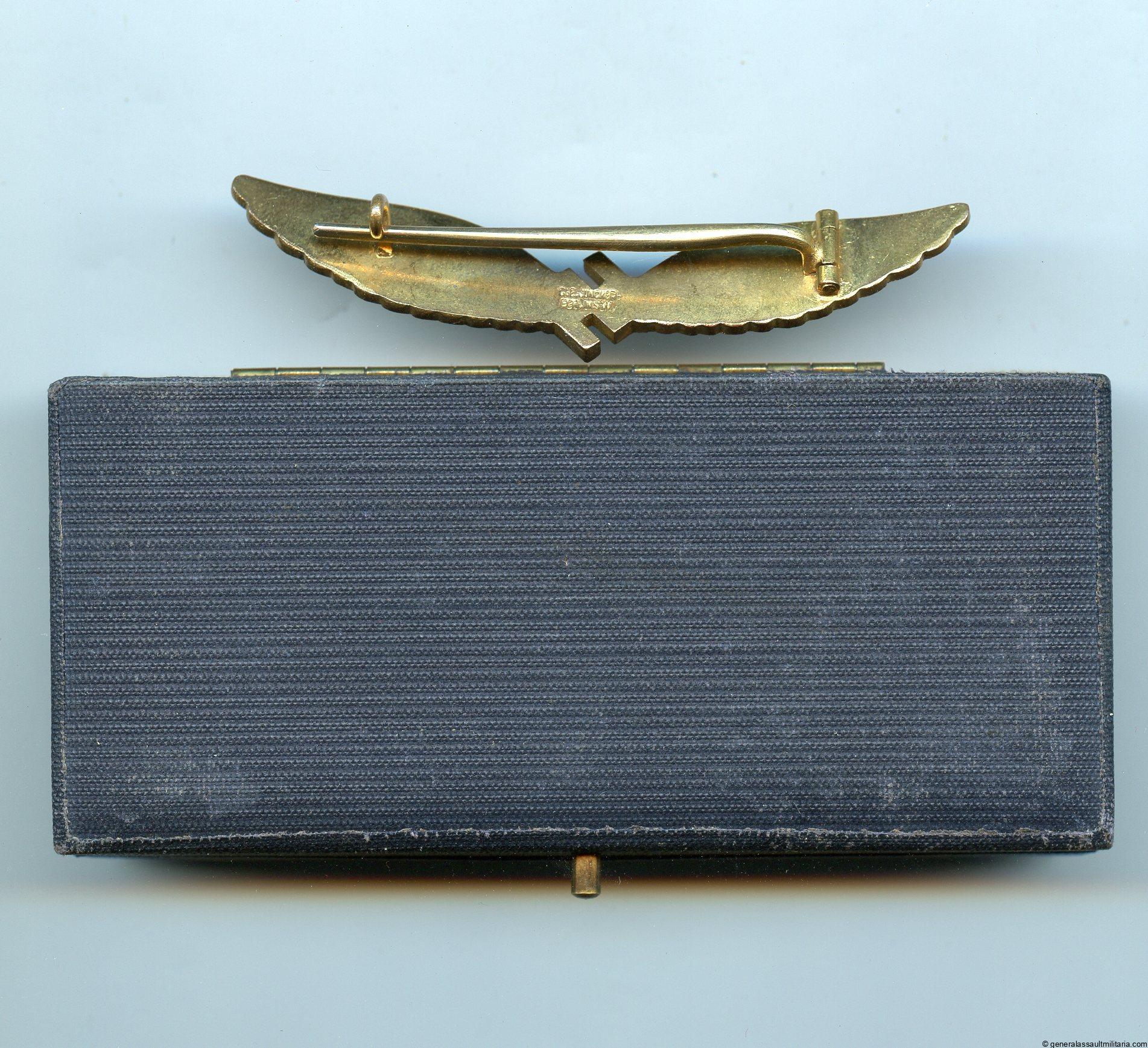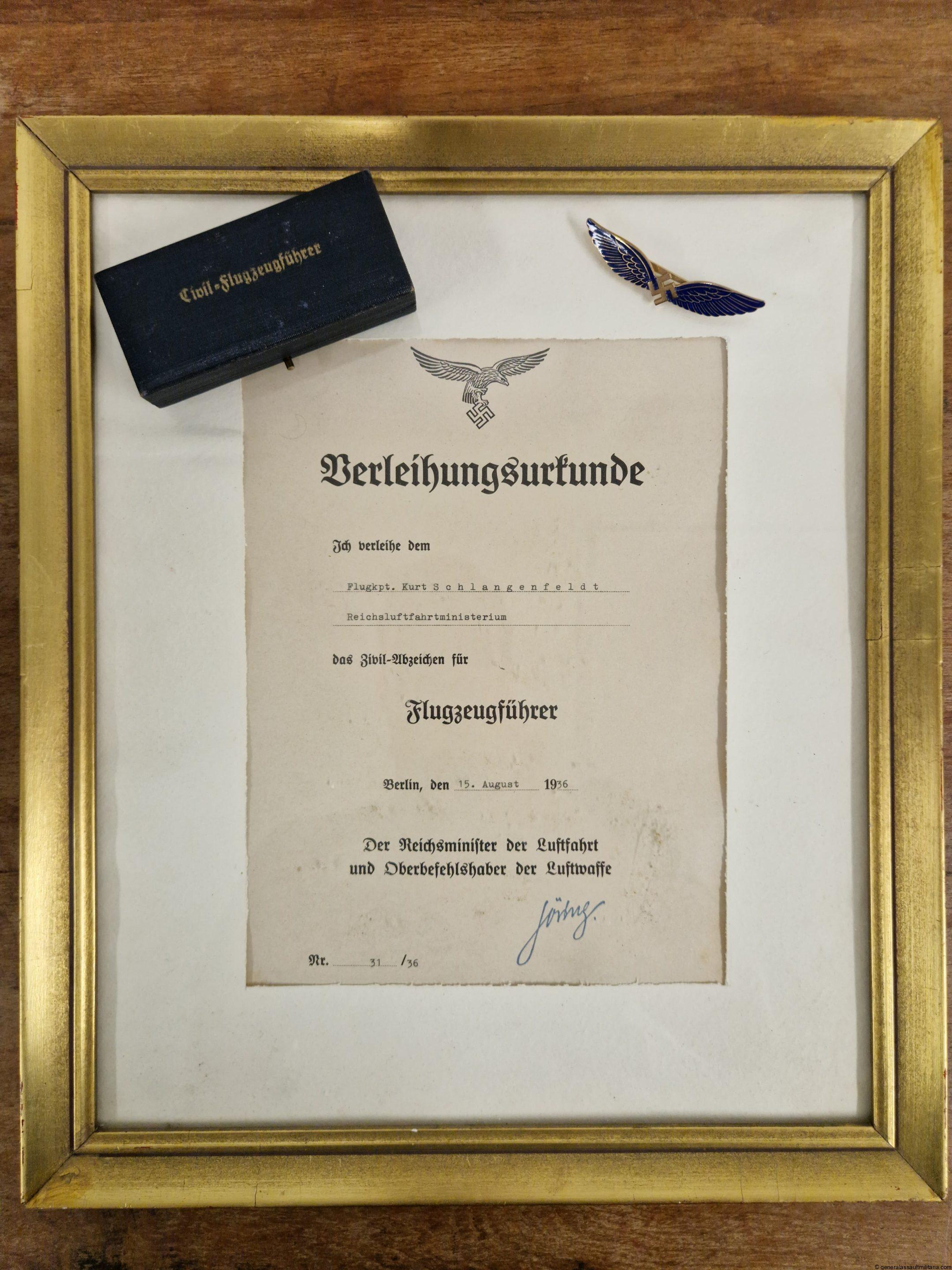 Luftwaffe civilian pilot badge set Flugkapitän Kurt Schlangenfeldt 1936. Very early Civilian pilot badge that was recently sold by the family and still together after almost 90 years. The gilded tombac Juncker marked clasp remains in excellent condition with no enamel damage and a still beautiful blue color to the enamel. Comes with the matching case with gold lettering on the front, showing only minimal wear and still clean inside. The award document with facsimile Göring signature is still in excellent condition and framed long ago. Very rare complete set that almost never appears to for sale.