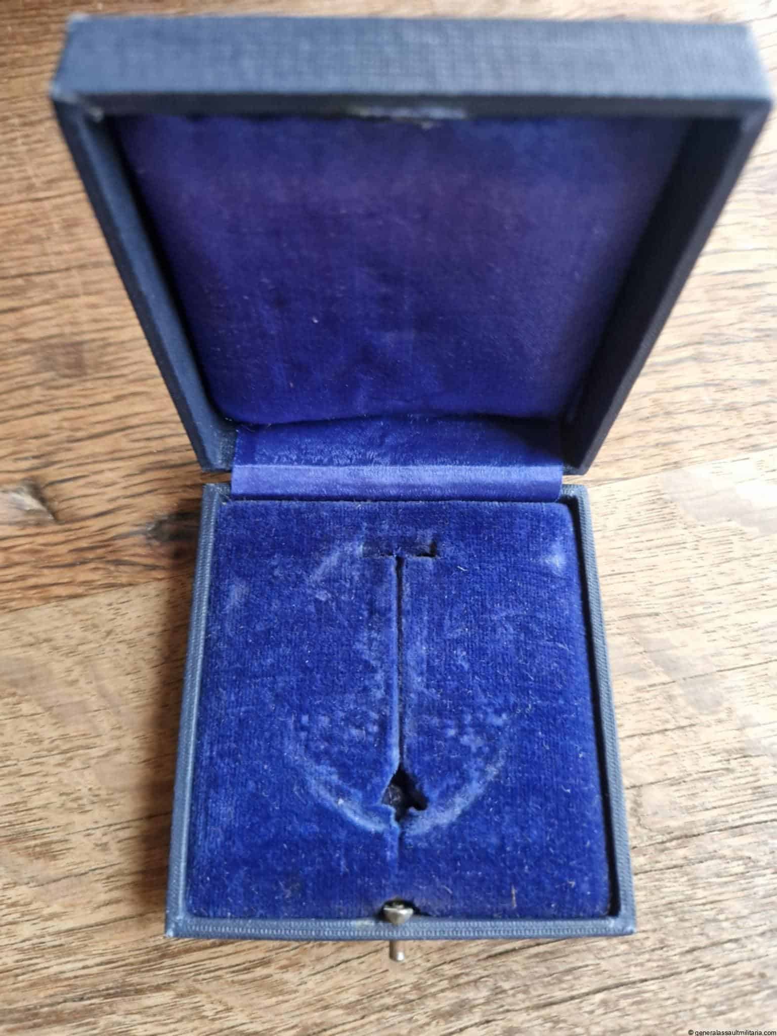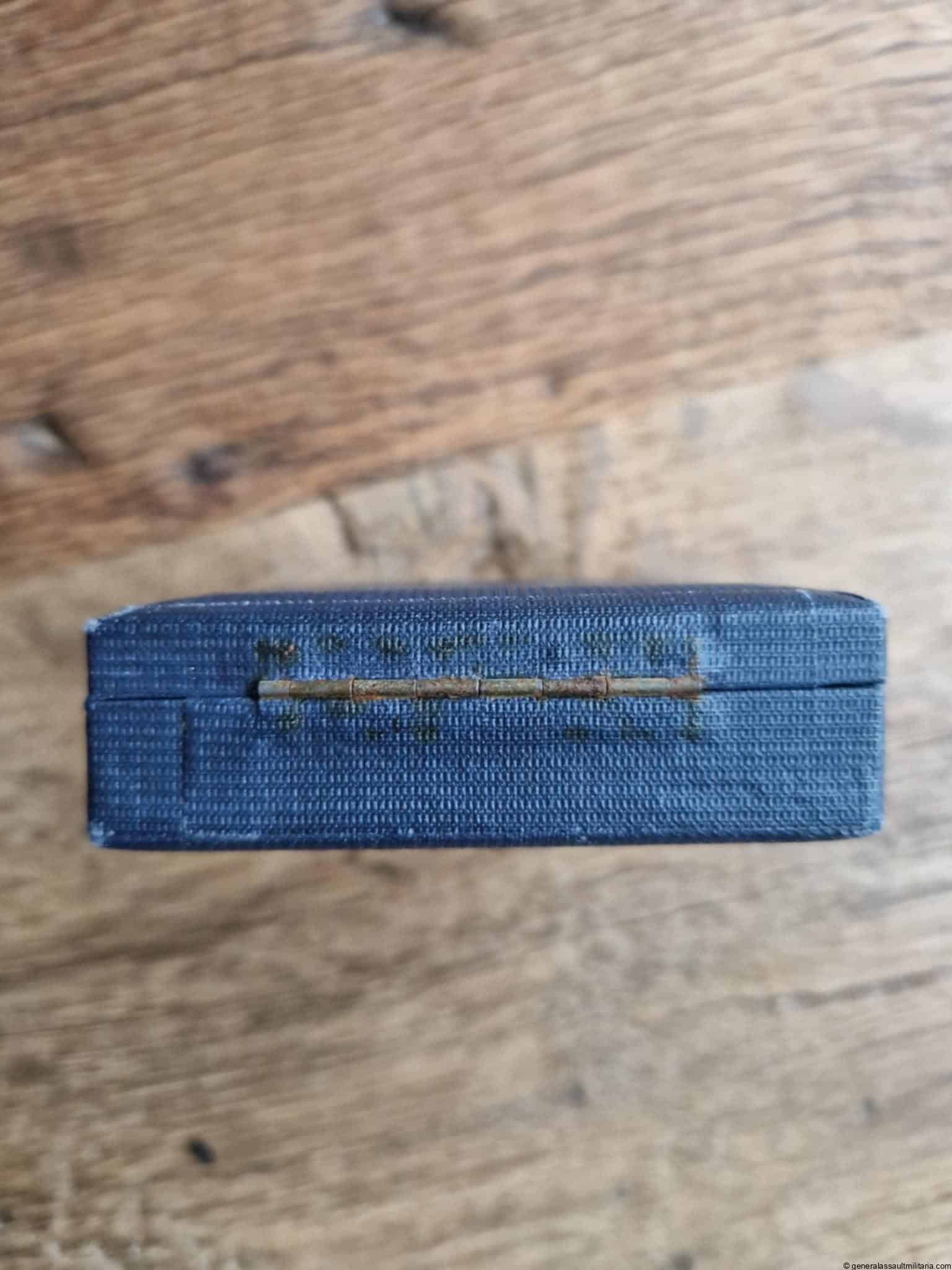 Luftwaffe combined pilot-Observer badge case. Early or pre war case for the ‘Gemeinsames Flugzeugführer-Beobachter Abzeichen’ aka ‘Doppelabzeichen’. Remains in near mint condition with gold lettering on top ‘Flieger-U. Beobachterabz.’. Shows nearly no age and wear to the out or inside and fits perfectly with IMME, J1, J2, A1 and a few more rarer variants. Very difficult to find single case for a rare Luftwaffe award.