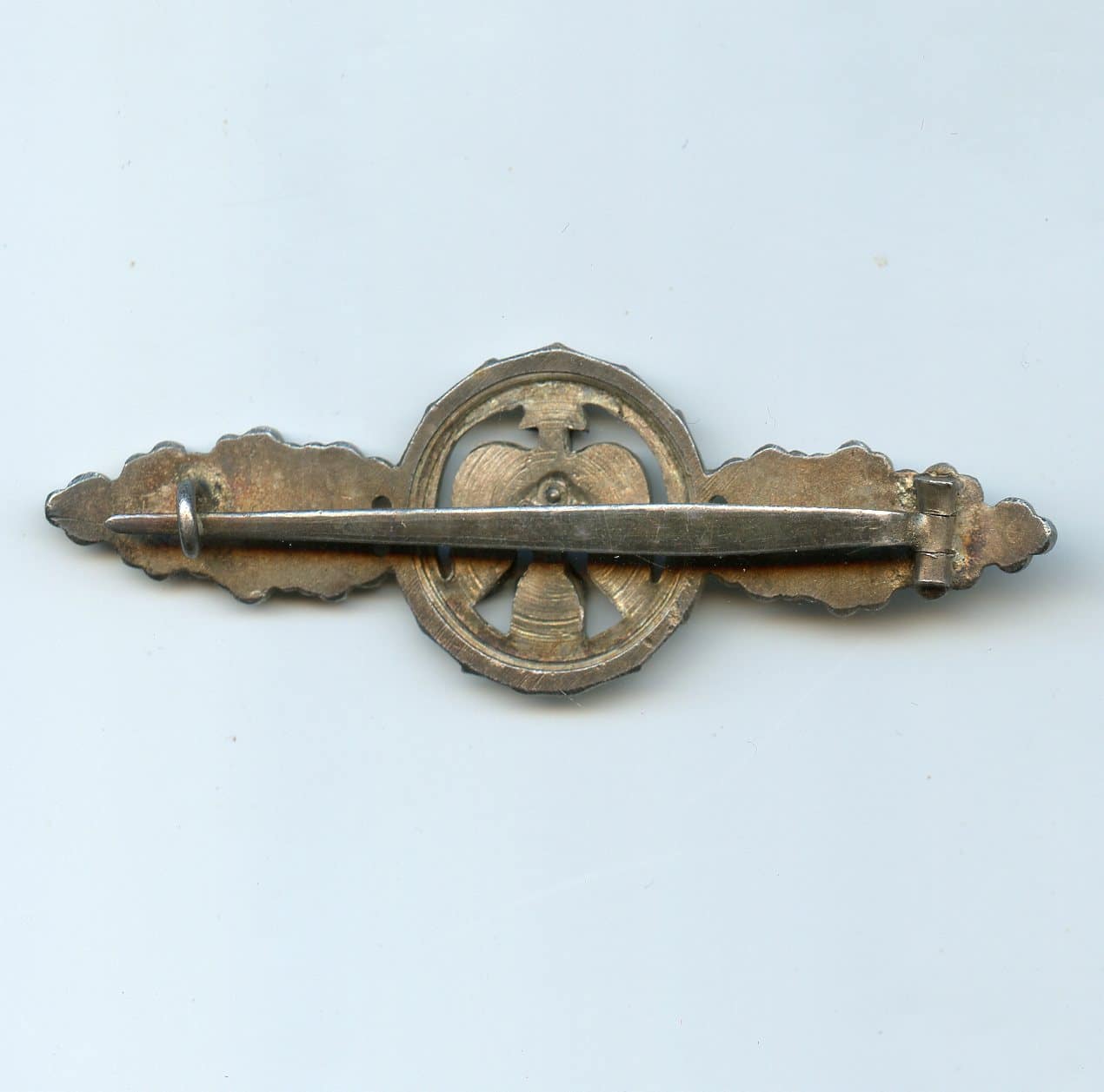 Luftwaffe fighter clasp – C.E. Juncker, Berlin. Early tombac ‘Frontflugspange für Jäger in Silber’ with silver plated finish. Remains in lightly worn condition with some of the burnishing worn down on the riveted arrow device and nearly all silver finish still present. Top lightly worn Jäger clasp with good patina on the reverse and bright look on the front.