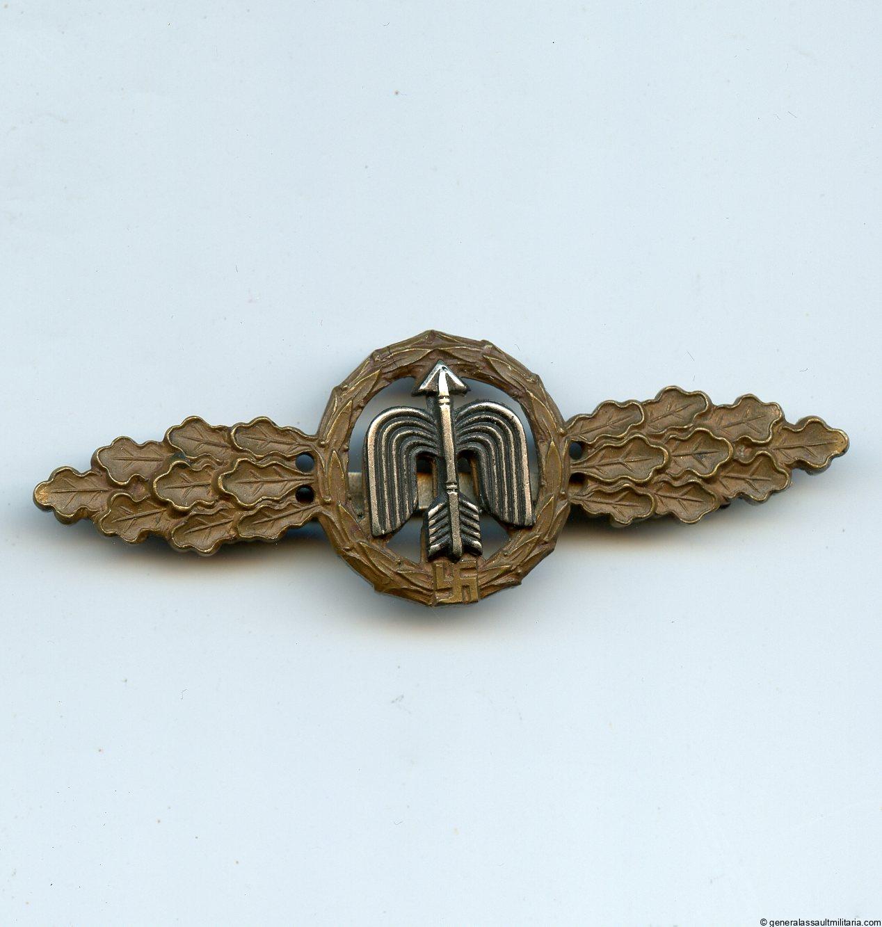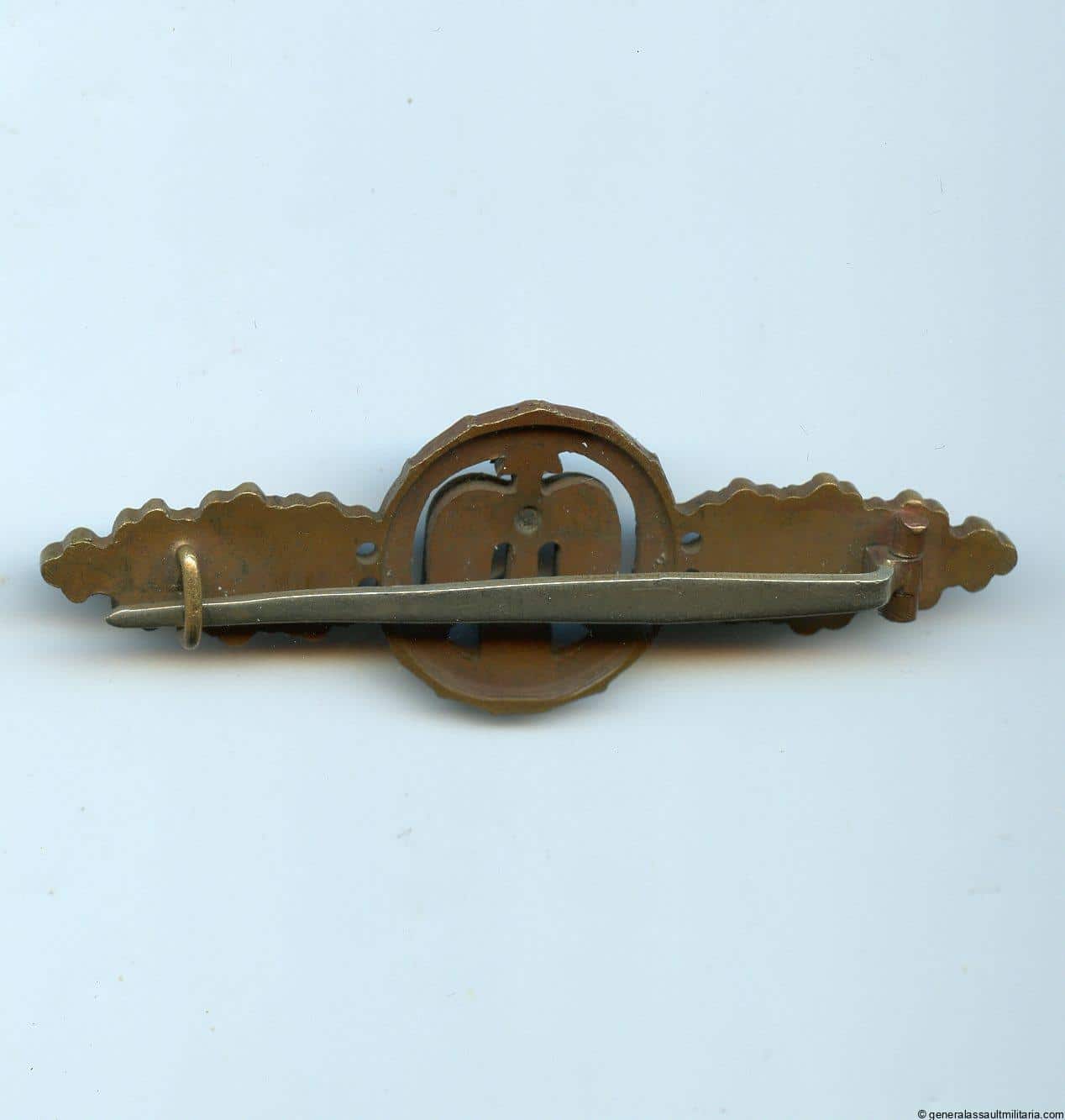 Luftwaffe Fighter clasp in bronze – C.E. Juncker, Berlin. Early war tombac ‘Frontflugspange für Jäger in Bronze’ with Juncker design and dark bronze finish. Remains in very lightly worn to unworn condition with full bronze finish still present. The riveted arrow device retains nearly all the burnishing. Uncommon and sought after fighter pilot badge.