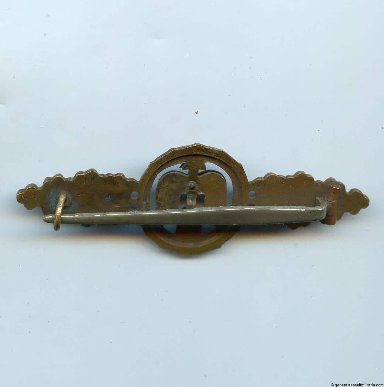 Luftwaffe Fighter clasp in bronze – C.E. Juncker, Berlin. Early war tombac ‘Frontflugspange für Jäger in Bronze’ with Juncker design and dark bronze finish. Remains in very lightly worn to unworn condition with full bronze finish still present. The riveted arrow device retains nearly all the burnishing with light wear. Uncommon and sought after fighter pilot badge.