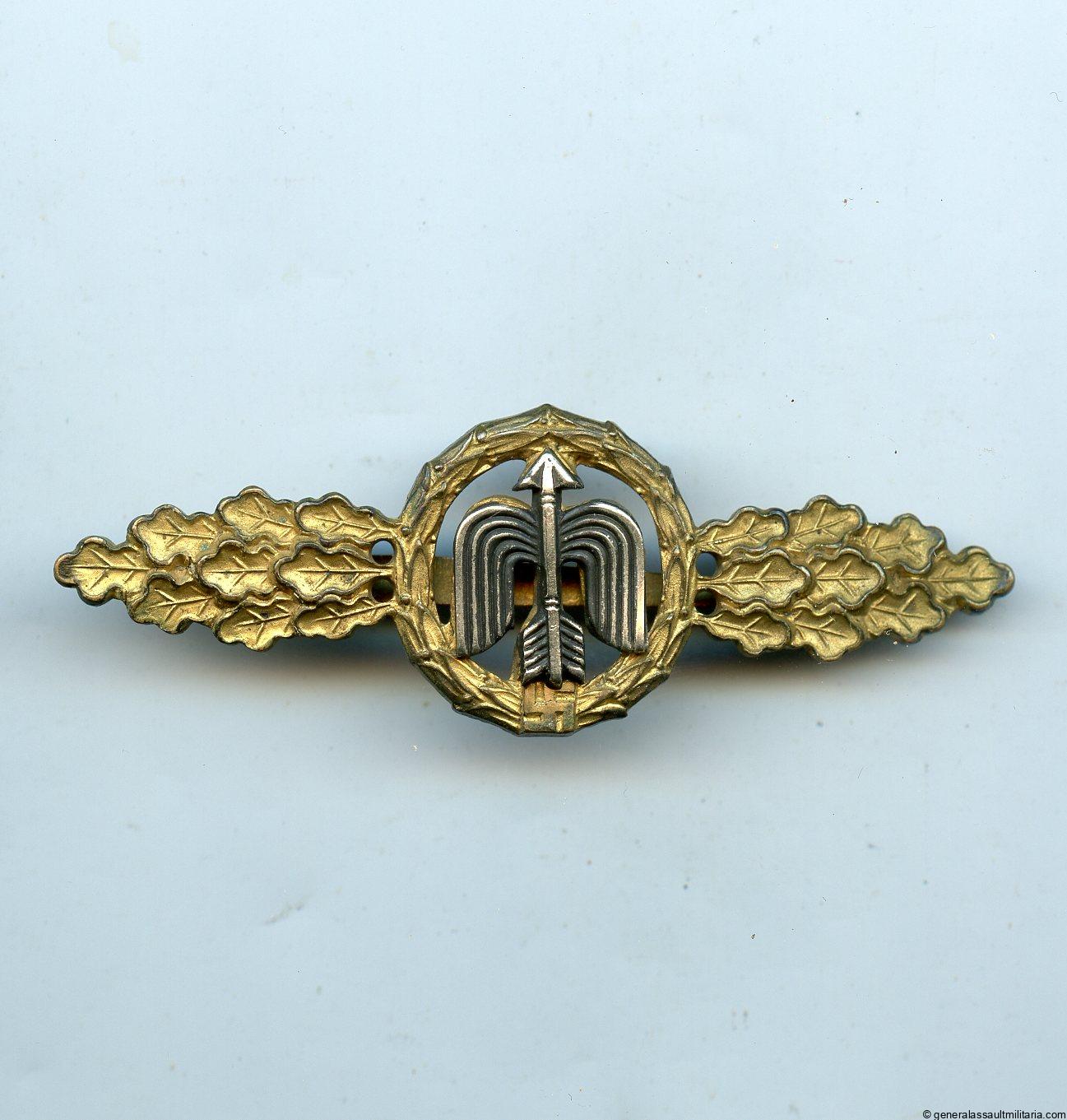 Luftwaffe fighter clasp in gold – C.E. Juncker, Berlin. Early war tombac j2 design clasp for a 100 missions, with gold finish and riveted burnished arrow device. Remains in beautifully worn condition with just the right wear pattern and most of the finish still present. Very uncommon and highly sought after gold Fighter clasp.