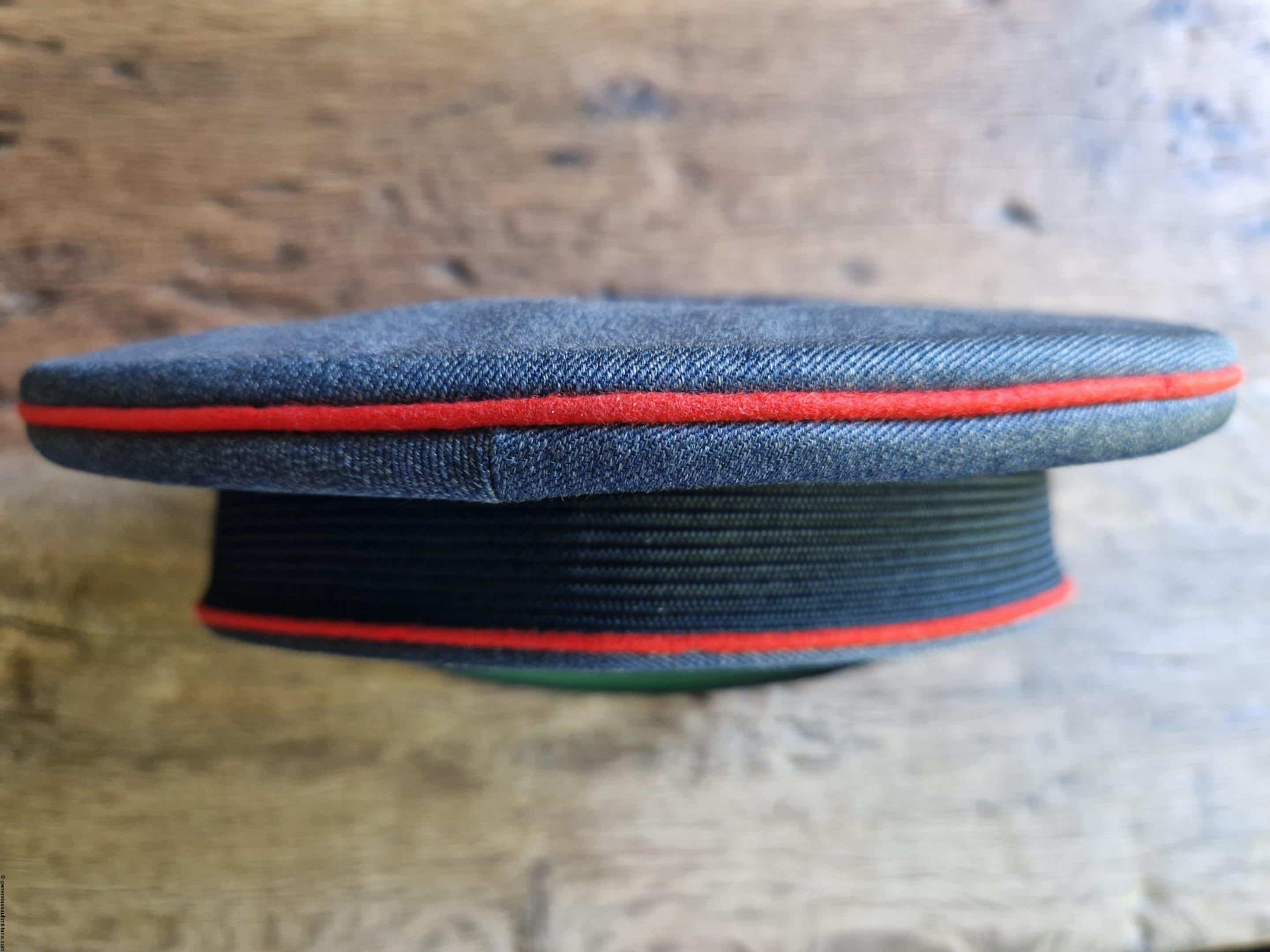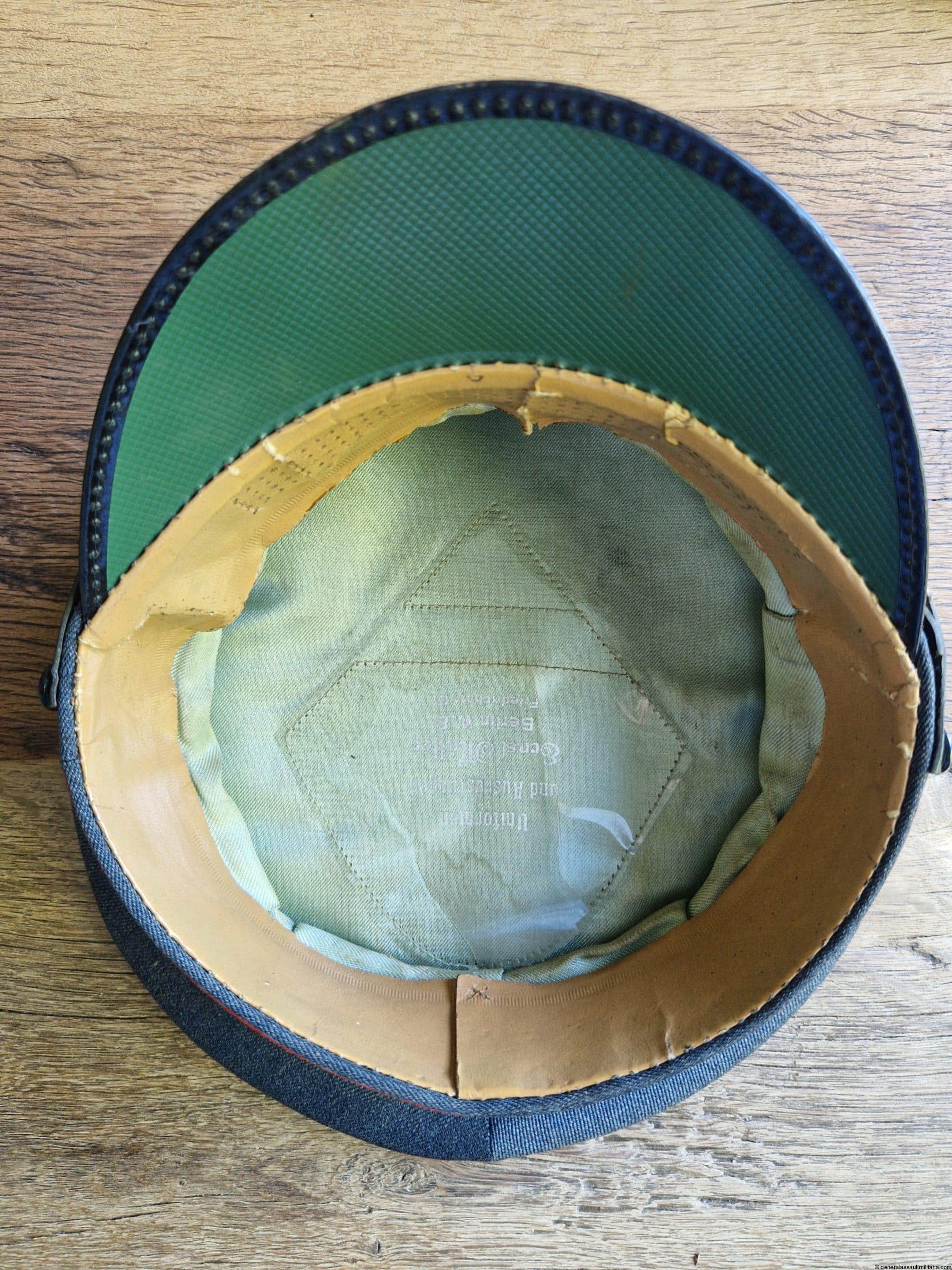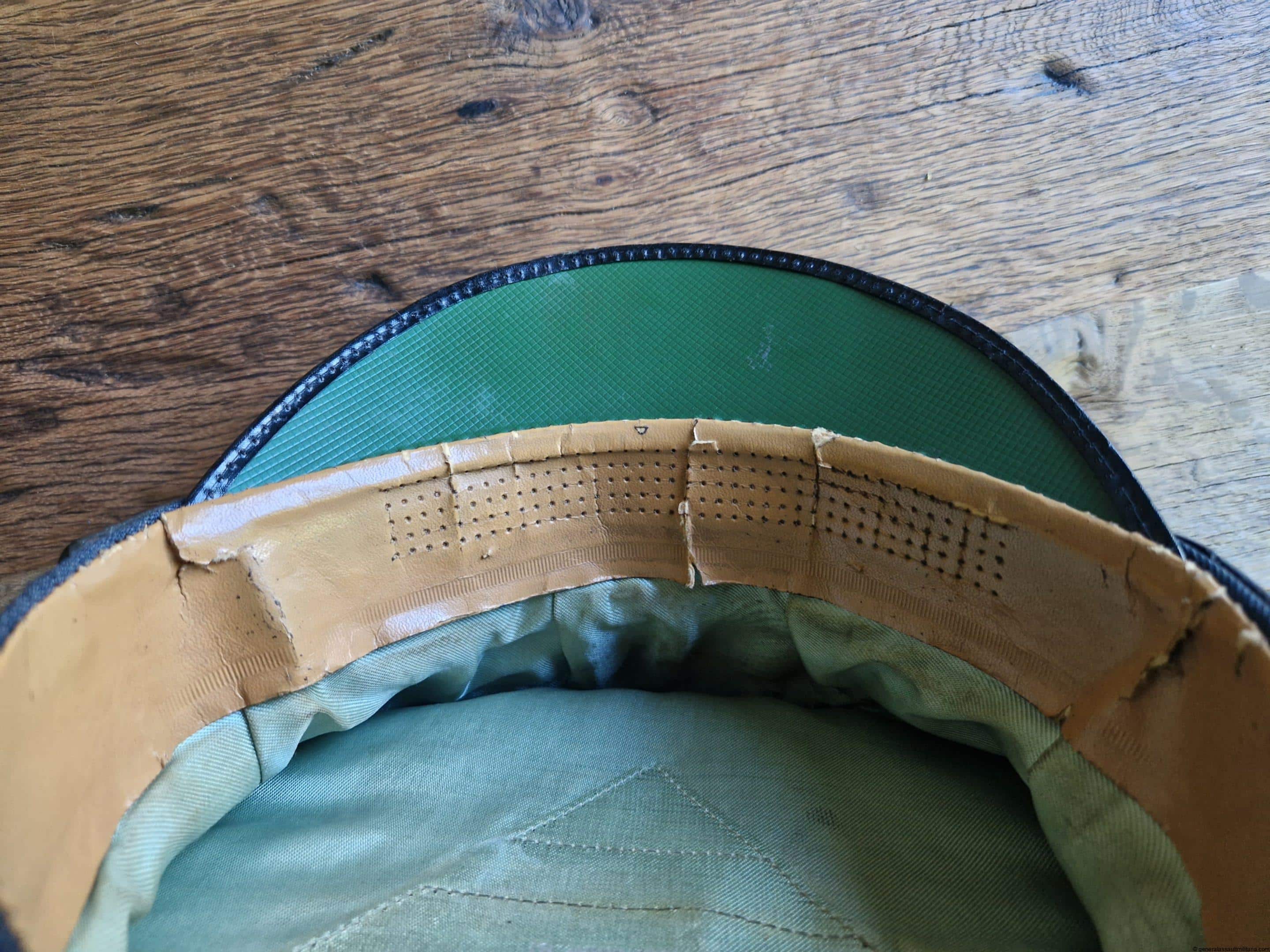 Luftwaffe Flak visor cap – Ernst Müller. Mid to late war Flak cap with zinc insignia produced by Ernst Müller Berlin W.8. Remains in good worn condition with some wear to the isignia and a still excellent looking outside with only minor moth damage to the piping at the back. Remains in its original shape and has some cracks/damage to the sweatband on the inside. Overall very good looking Flak Artillerie Schimmütze.