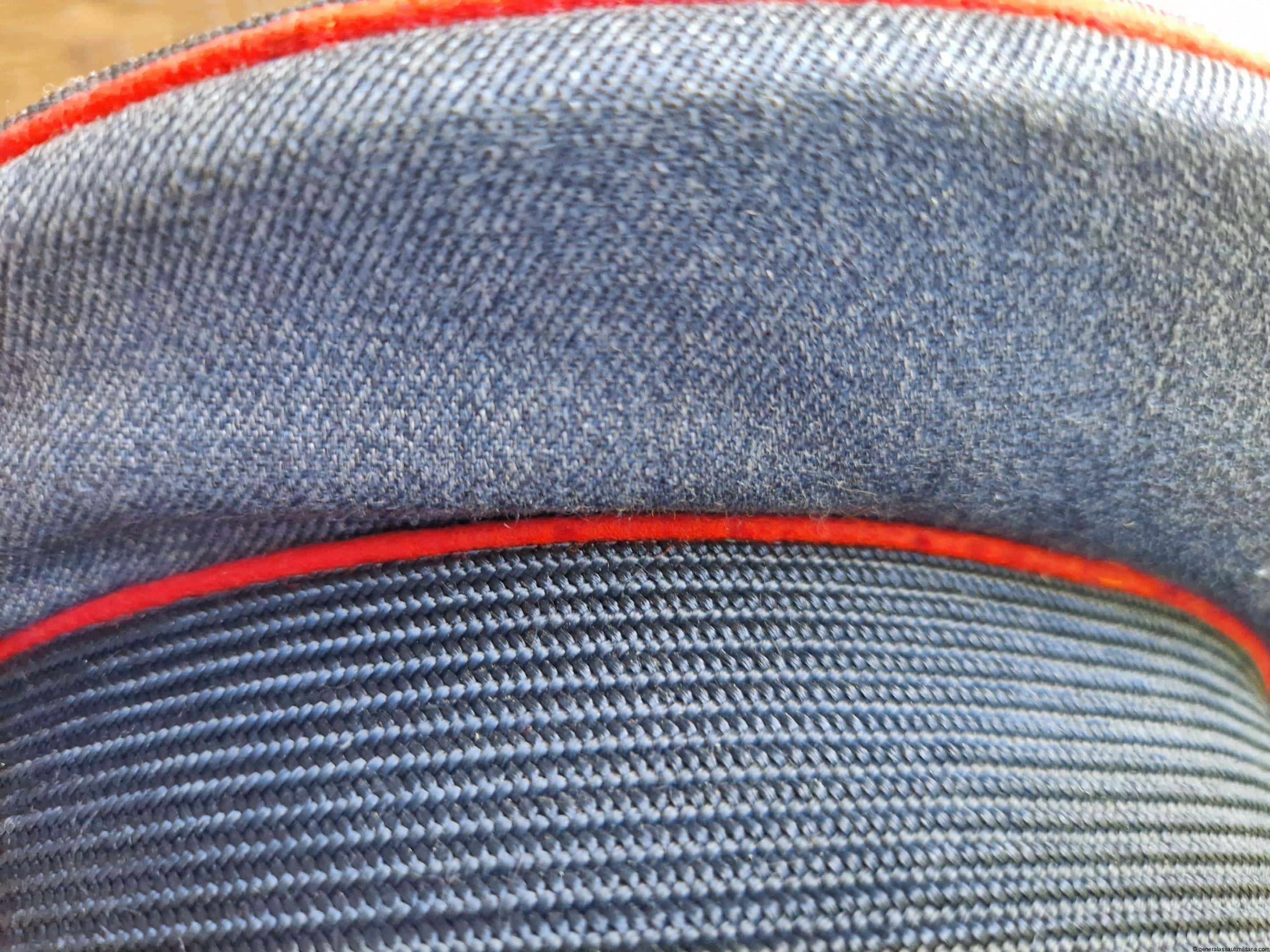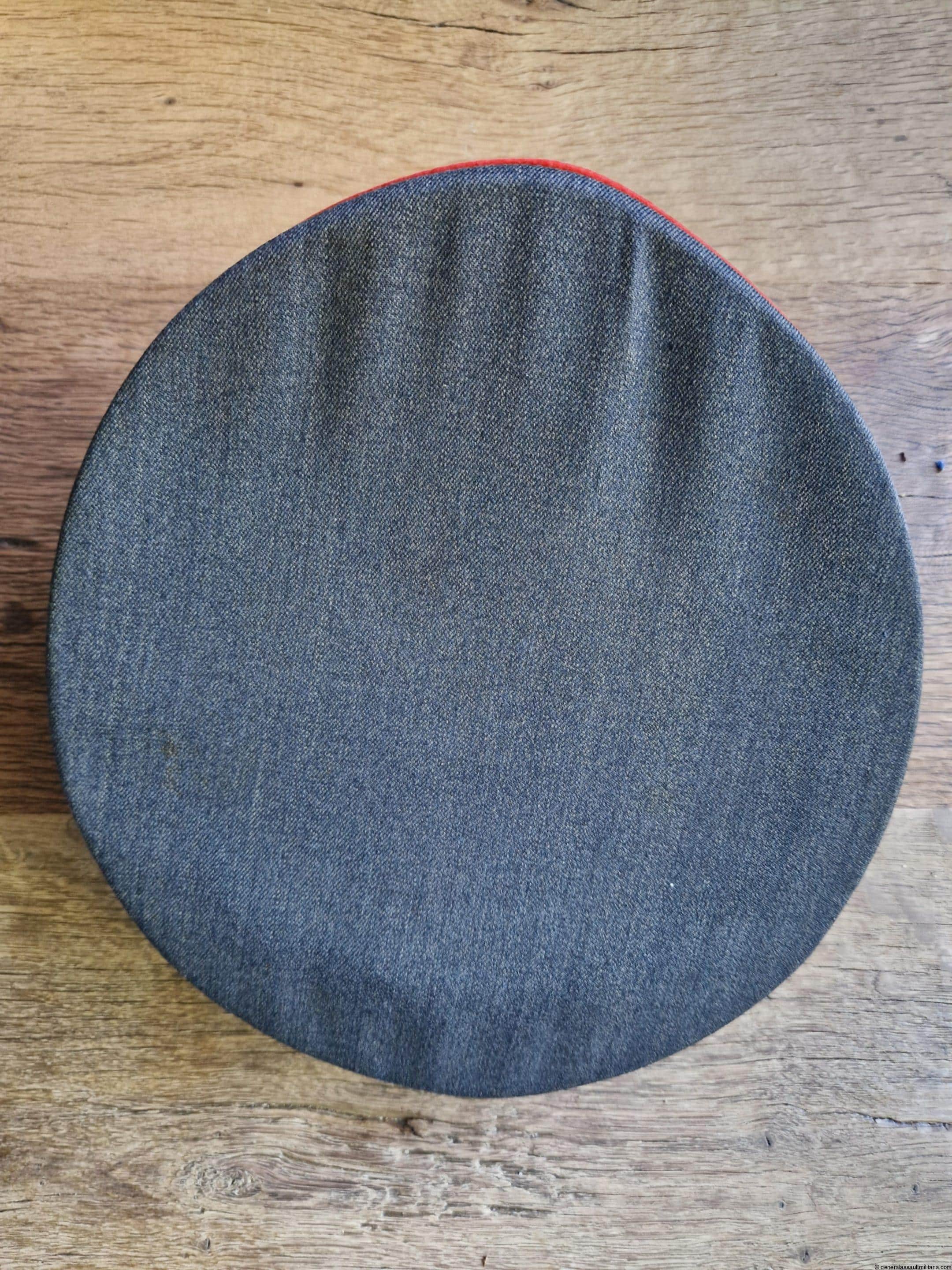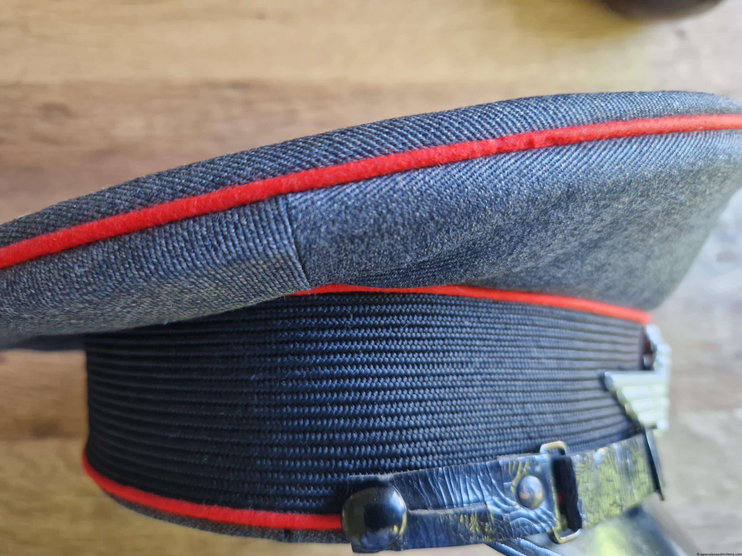 Luftwaffe Flak visor cap – Ernst Müller. Mid to late war Flak cap with zinc insignia produced by Ernst Müller Berlin W.8. Remains in good worn condition with some wear to the isignia and a still excellent looking outside with only minor moth damage to the piping at the back. Remains in its original shape and has some cracks/damage to the sweatband on the inside. Overall very good looking Flak Artillerie Schimmütze.