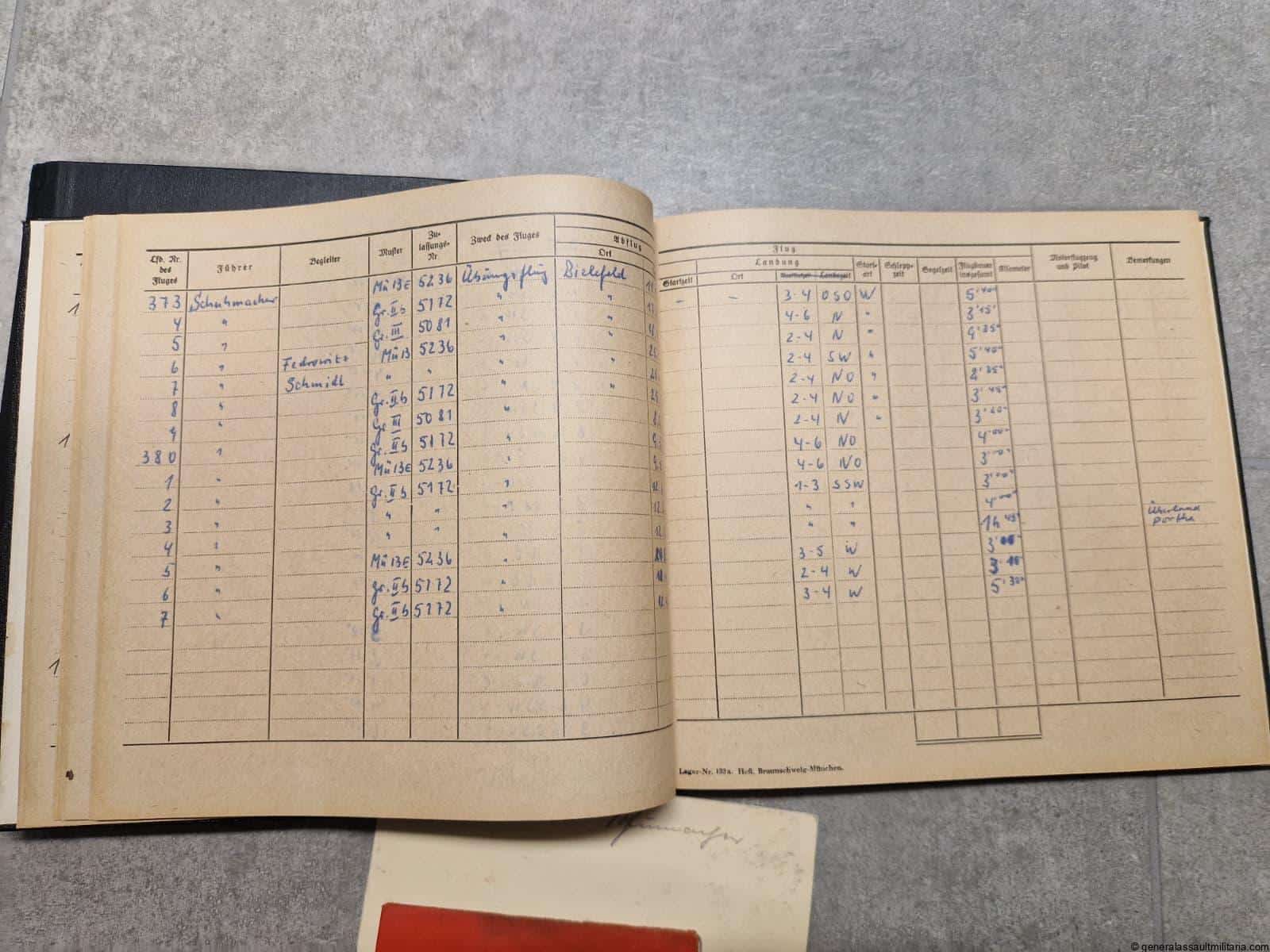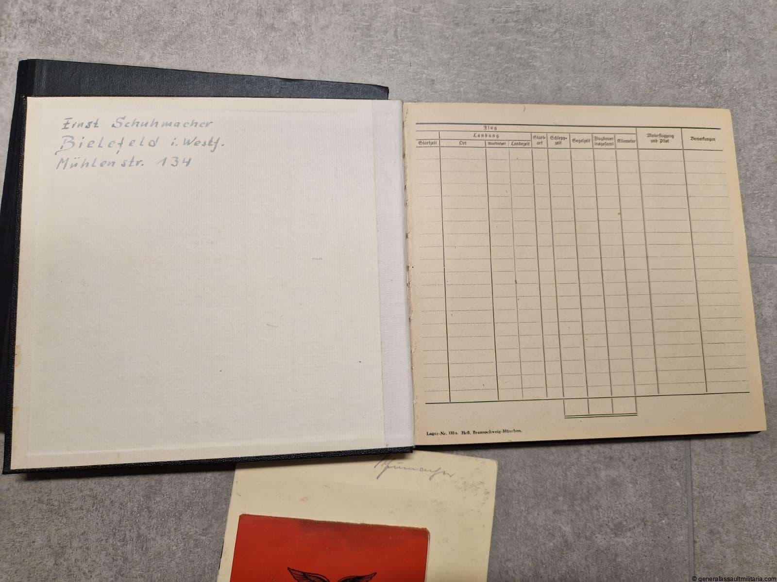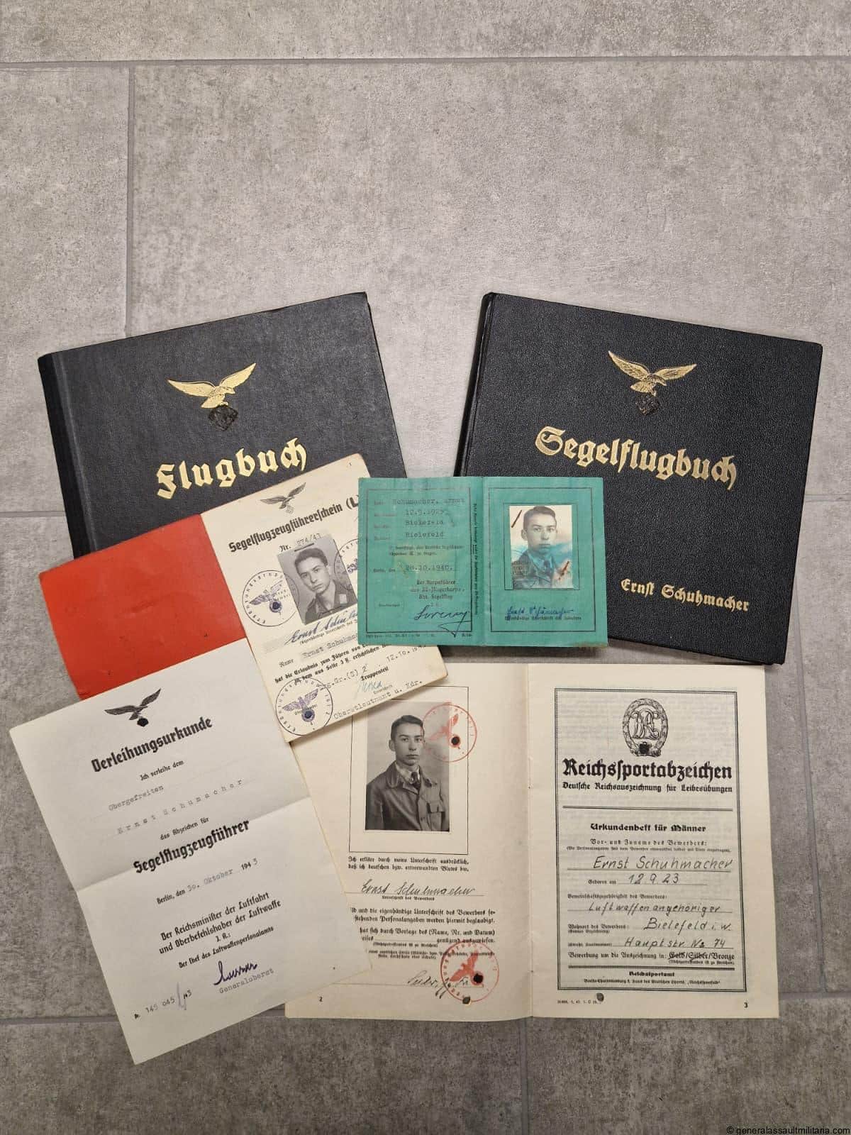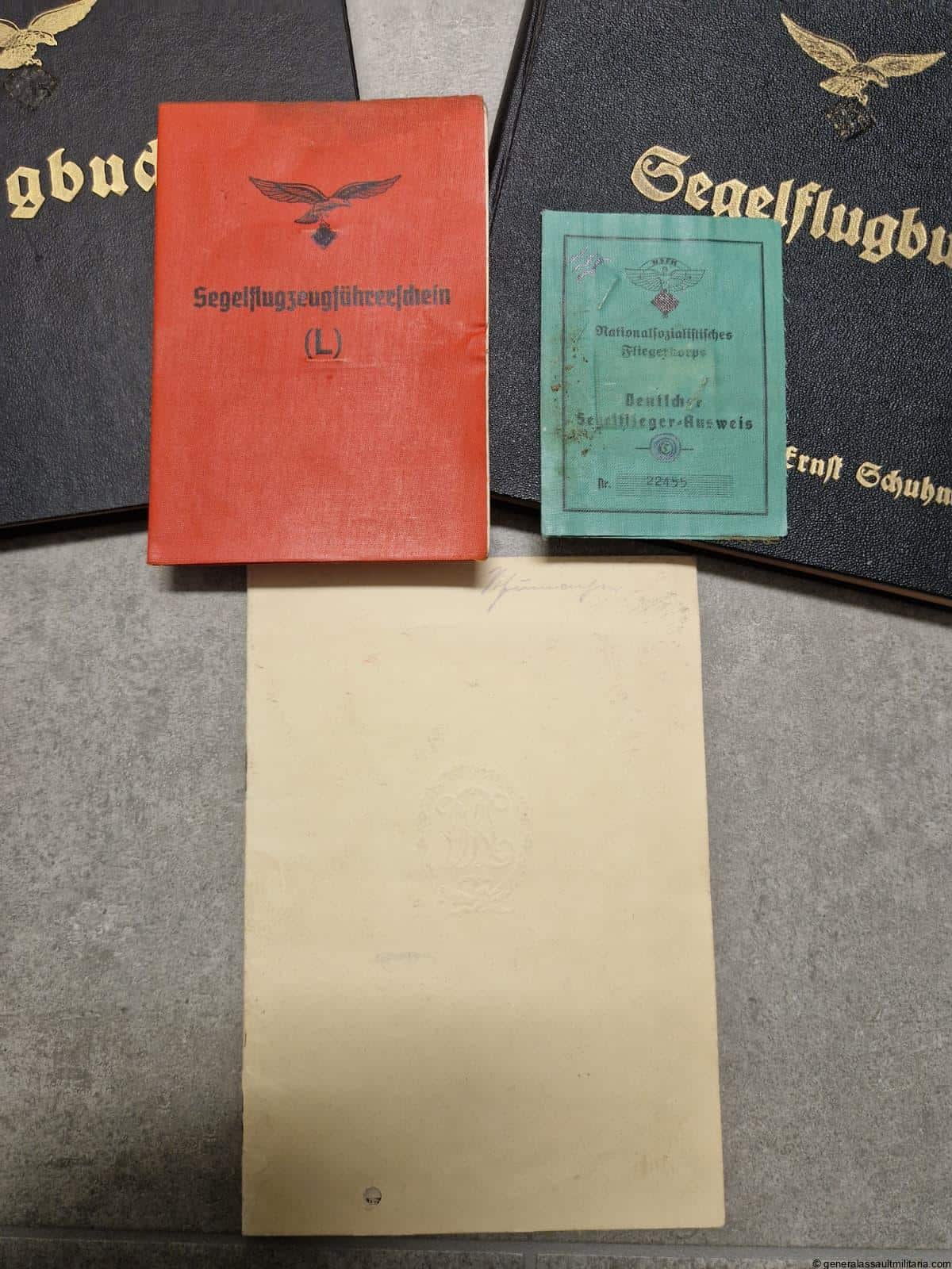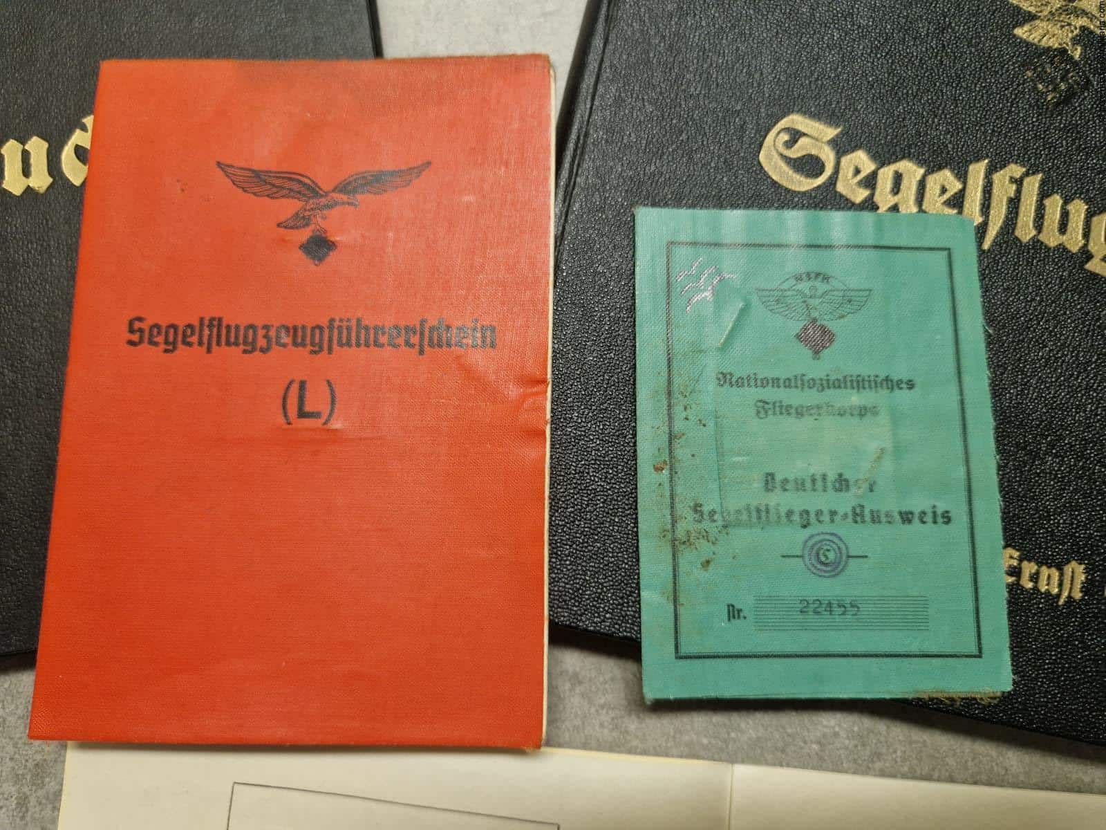 Luftwaffe Glider pilot group. Rare document set with flight books for a ‘Segelflugzeugführer’. Consist of the award document for glider pilot badge, both his pilot and glider pilot flight books for which he ordered a special cover with his name on it. His Glider pilot ID and NSFK glider ID, his DRL document with cloth badge. ALl documents and pieces remain in good condition except for all of them being denazified. Even with the denazi swastikas an extremely difficult to find set. Priced at a very reasonable price considering what a Glider pilot badge document normally sells for on its own.