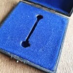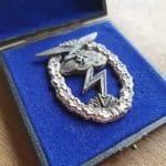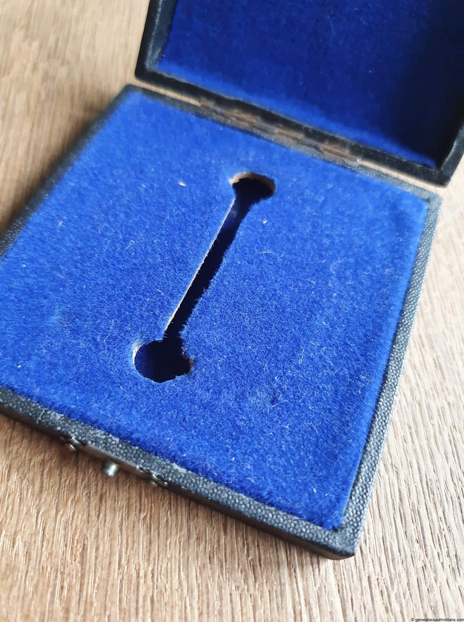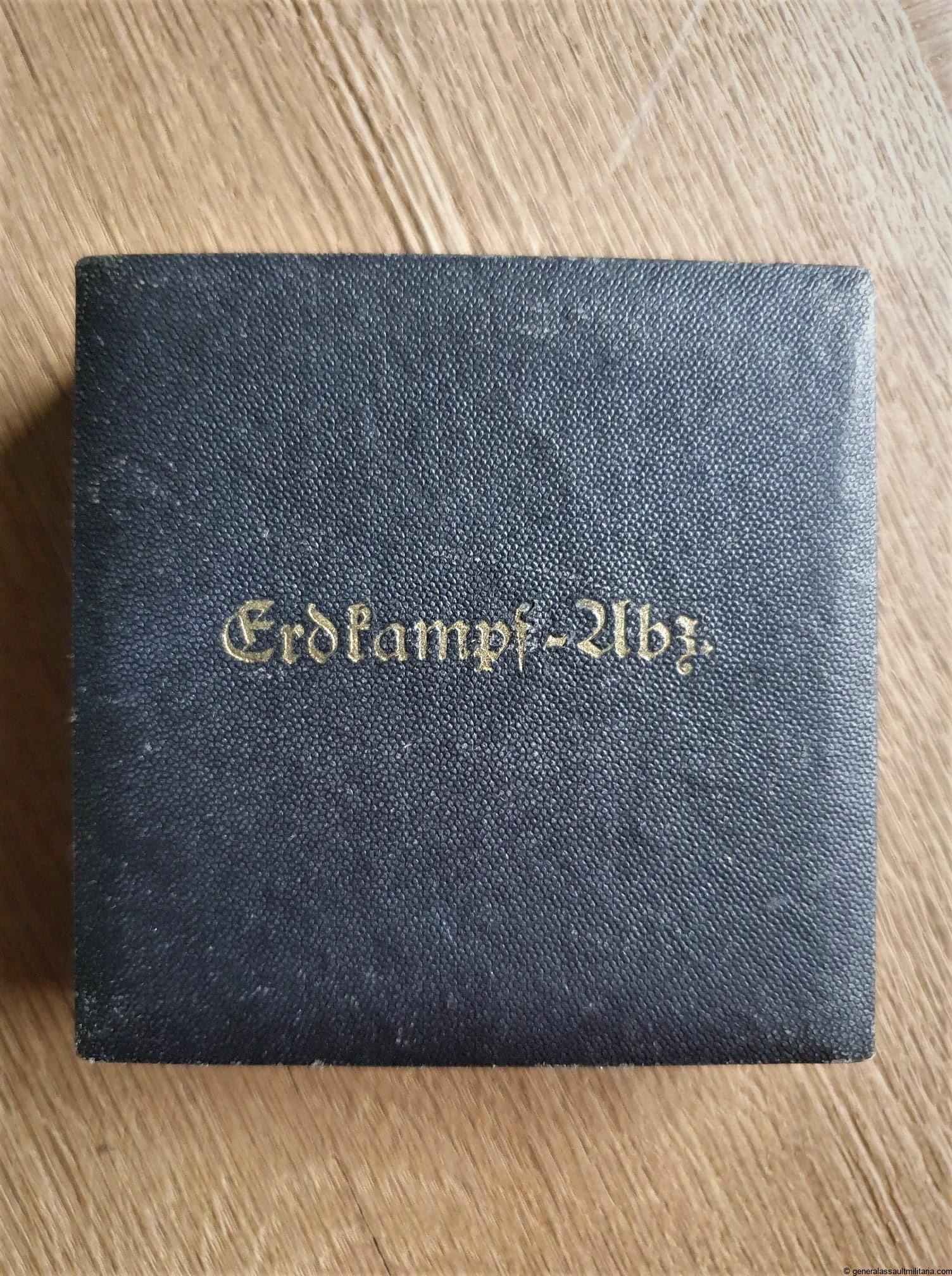 Luftwaffe ground assault badge + case – Gebrüder Wegerhoff, Lüdenscheid. Zinc Erdkampfabzeichen with GWL design and makers mark on the back. Remains in very good condition with most of the fragile finish still present on the badge. Crimped eagle and integral setup are still fully intact. Comes with matching and extremely difficult to find GWL case that reads Erdkampf-Abz on top. Normally seen with light blue paper backing, however this case was upgraded with a soft cloth covering at some point in time. Everything is still present including the original inlay, just the paper hinge flap got damaged and was removed. Has better appeal than the original case, but is still slightly altered.