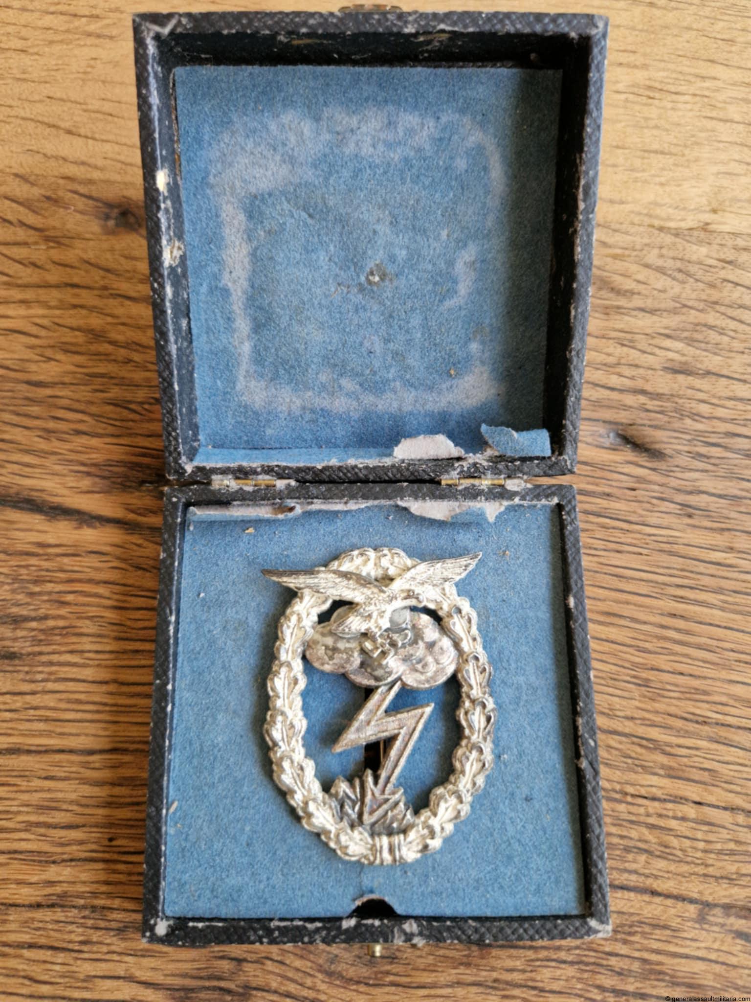 Luftwaffe ground assault badge cased – Gebrüder Wegerhoff, Lüdenscheid. Mid to late war two piece zinc ‘Erdkampfabzeichen’ with GWL makers mark and silver plated finish. Remains in unworn condition with full finish remaining and typical zinc bubbling on the surface. Comes with very rare unmarked GWL case that can also sometimes be found marked with the gold text Erdkampfabz. Case remains in good condition with normal wear on the outside, both hinge intact and separation on the blue paper hinge flap on the inside. Very difficult to find set with minty GWL LW GAB.