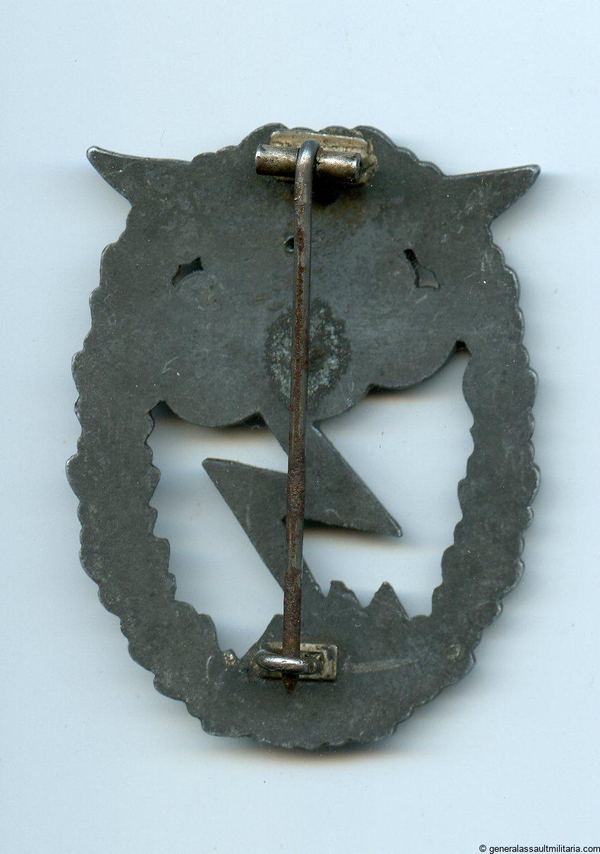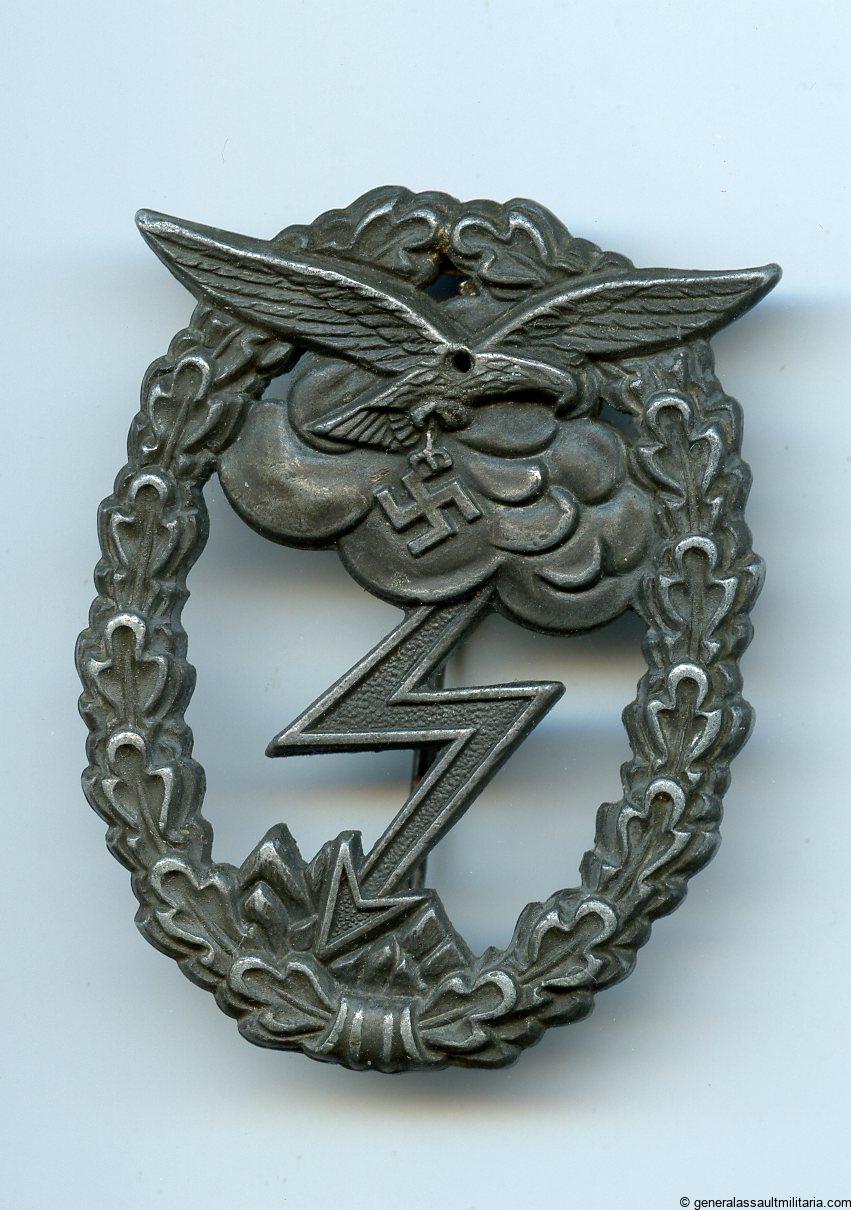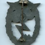 Luftwaffe ground assault badge – J.E. Hammer & Söhne, Geringswalde. Mid to late war zinc Erdkampfabzeichen with the silvered tombac ealge missing missing. All the finish has faded giving the badge a grey appearance.