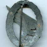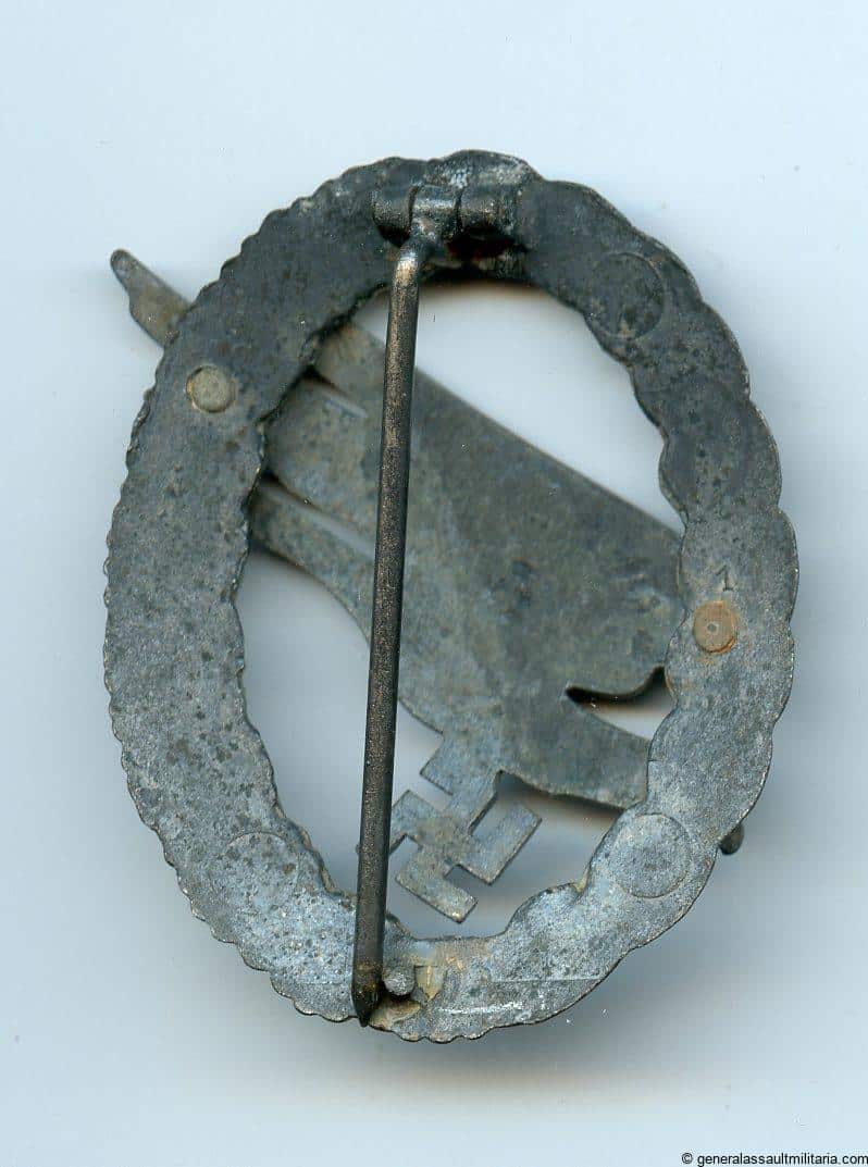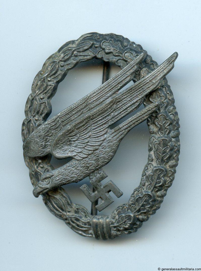 Luftwaffe paratrooper badge – Assmann & Söhne, Lüdenscheid. Late war zinc ‘Fallschirmjäger’ badge with assmann Die 1 wreath and typical zinc Assmann eagle. Remains worn condition and has the finish in faded condition. The integral catch broke at some point in time. Good looking front but with broken catch, priced accordingly.