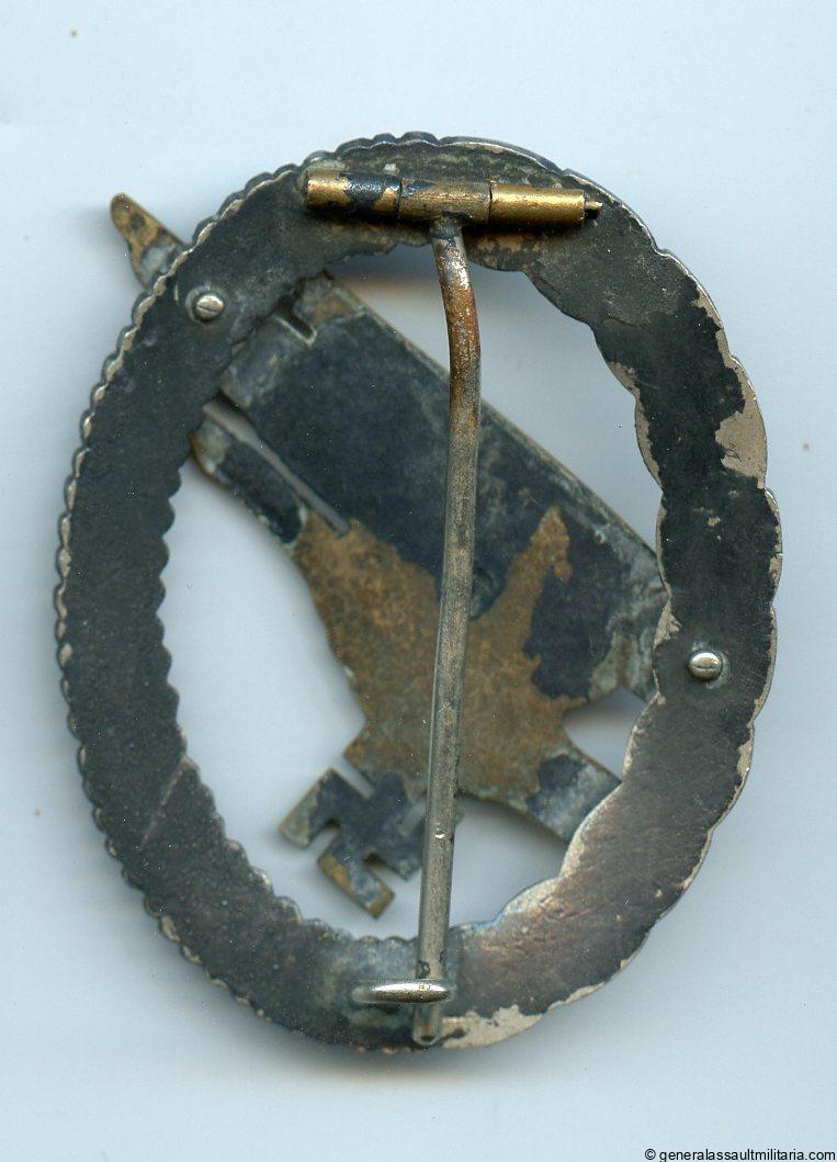 Luftwaffe paratrooper badge – Brüder Schneider, Wien. Early war Nickel silver wreath paratrooper badge with tombac riveted eagle maker marked with the BSW logo. Remains in well worn condition and lost the original burnishing and gilding on the eagle. Shows some sort of thick grey residue on the eagle and wreath, which shows clear signs of age. Example with lots of character.