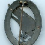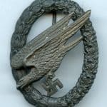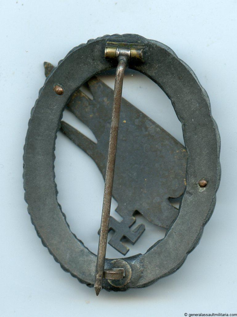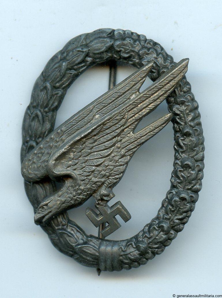 Luftwaffe para trooper badge – C.E. Juncker, Berlin. Zinc eagle with riveted zinc wreath and tombac rivets. Remains in very good condition with all the thin original finish present but in faded condition. Type-H Juncker variant with unmarked eagle. Nicely preserved example even with the faded finish.