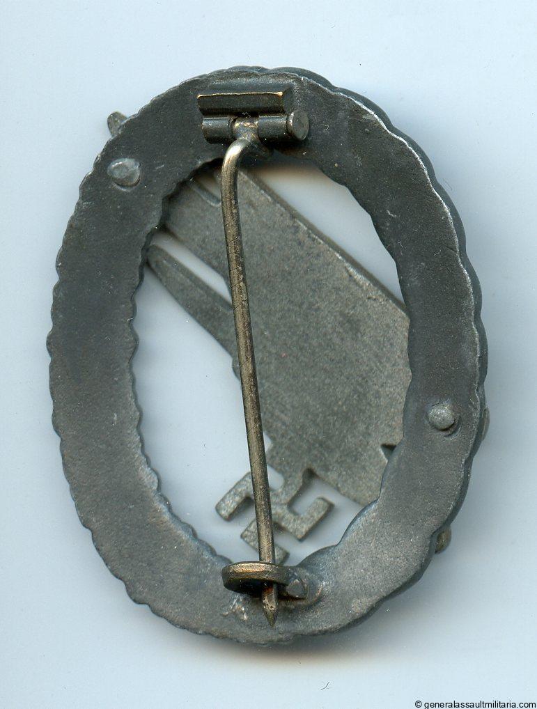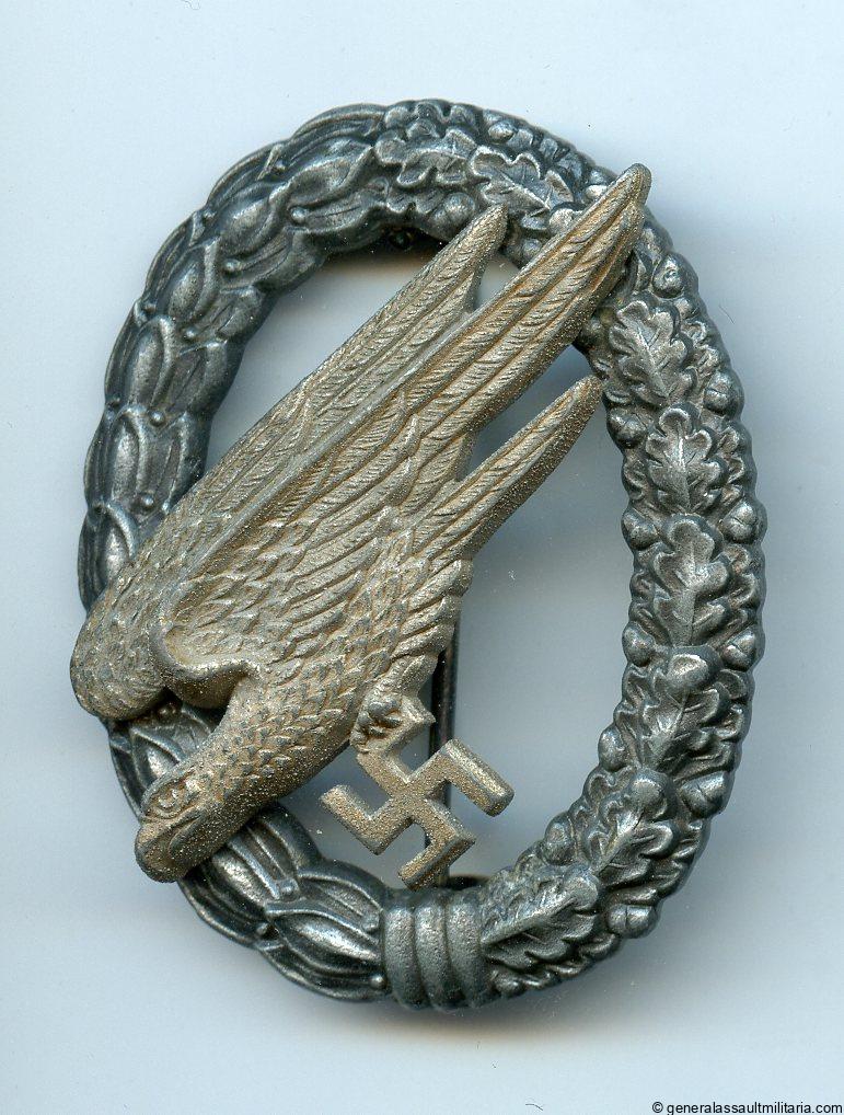 Luftwaffe paratrooper badge – Friedrich Linden, Lüdenscheid. Zinc wreath with gilded riveted eagle. Remains in very lightly worn condition with most of the gilding still present. Textbook FLL type C with typical FLL catch and hinge. Well preserved mid war Lüdenscheid Fallschrimjäger badge.