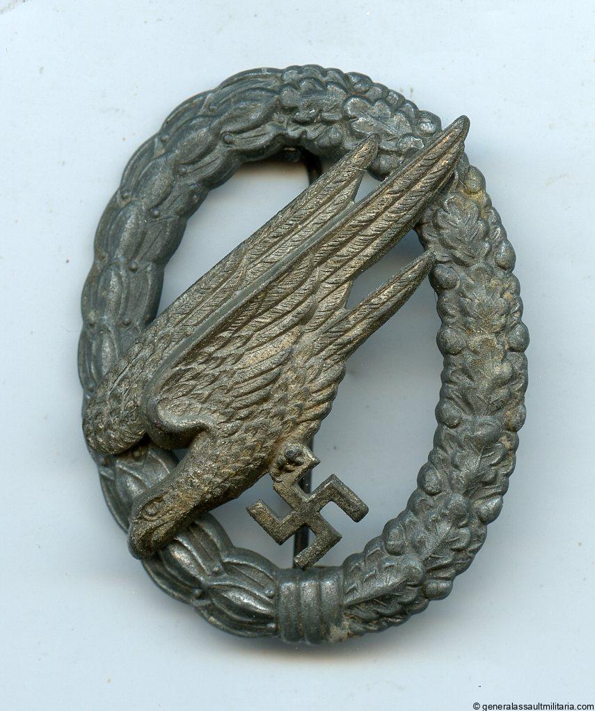 Luftwaffe paratrooper badge – Friedrich Linden, Lüdenscheid. Zinc wreath with gilded riveted eagle. Remains in very lightly worn condition with most of the gilding still present. Textbook FLL type C with typical FLL catch and hinge. Well preserved mid war Lüdenscheid Fallschrimjäger badge.