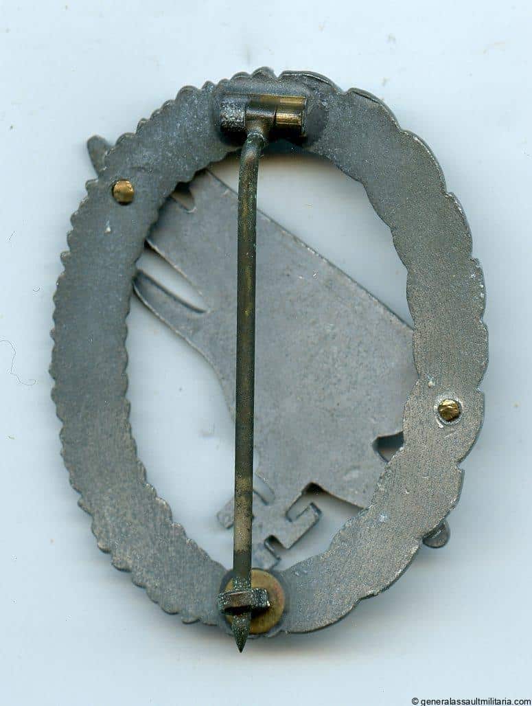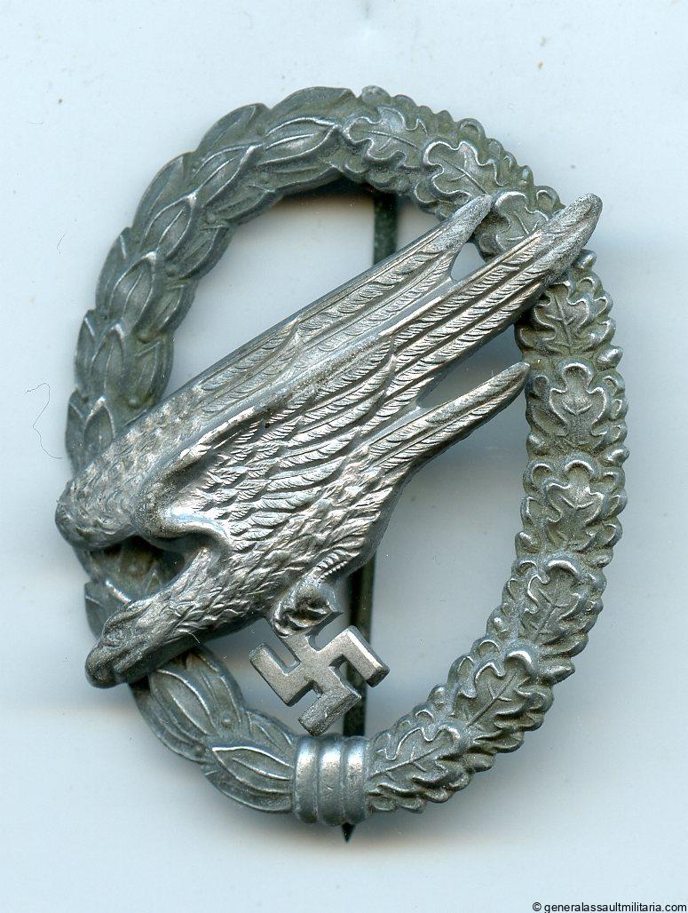 Luftwaffe paratrooper badge – Steinhauer & Lück, Lüdenscheid. Late war zinc wreath and rivited zinc eagle type B ‘Fallschirmjäger’ badge with S&L design. Remains in lightly worn to unworn condition with still a slightly faded but still good silver appearance to the eagle. Very sharp looking design that is closely related to the Juncker design. Quite uncommon variant.