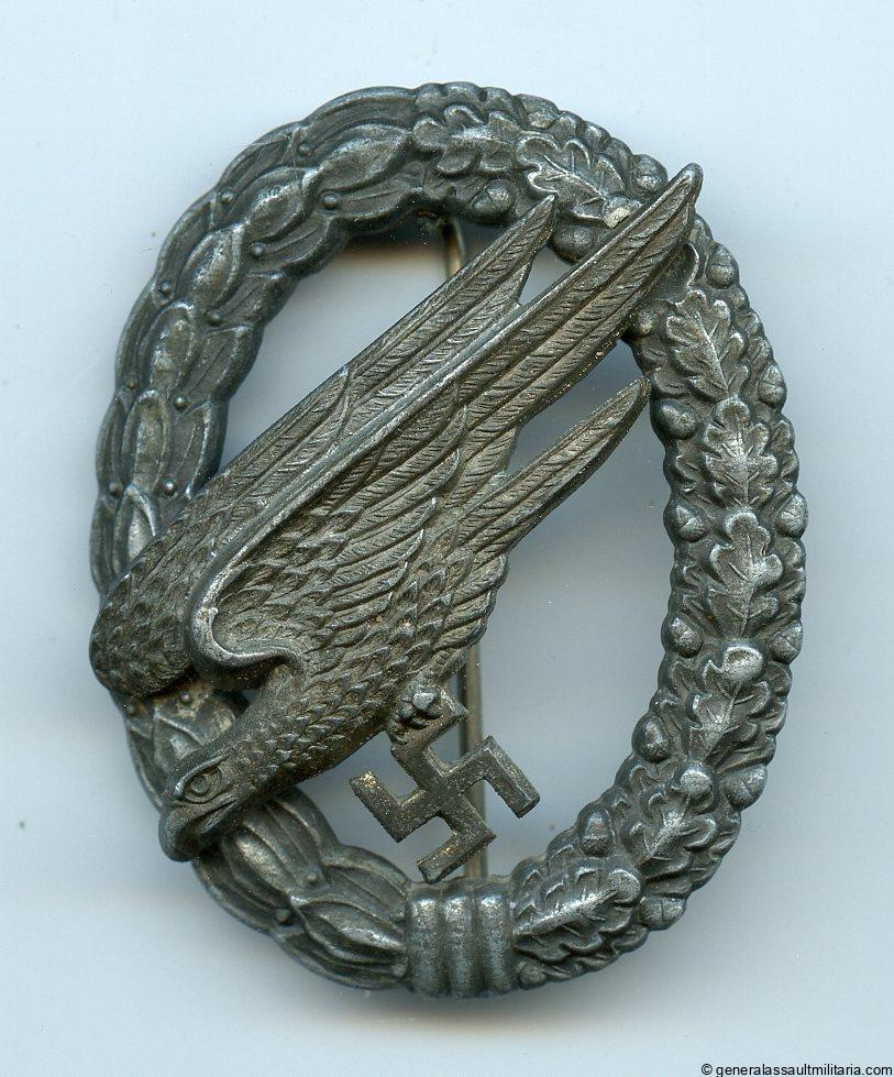 Luftwaffe paratrooper badge – Type D Friedrich Linden, Lüdenscheid. Late war zinc para badge with FLL design and catch. Remains in lightly worn condition with most of the finish remaining on the eagle with a darkened look to it. Shows good contrast with the wreath and overall a very nicely preserved mid to late war example.