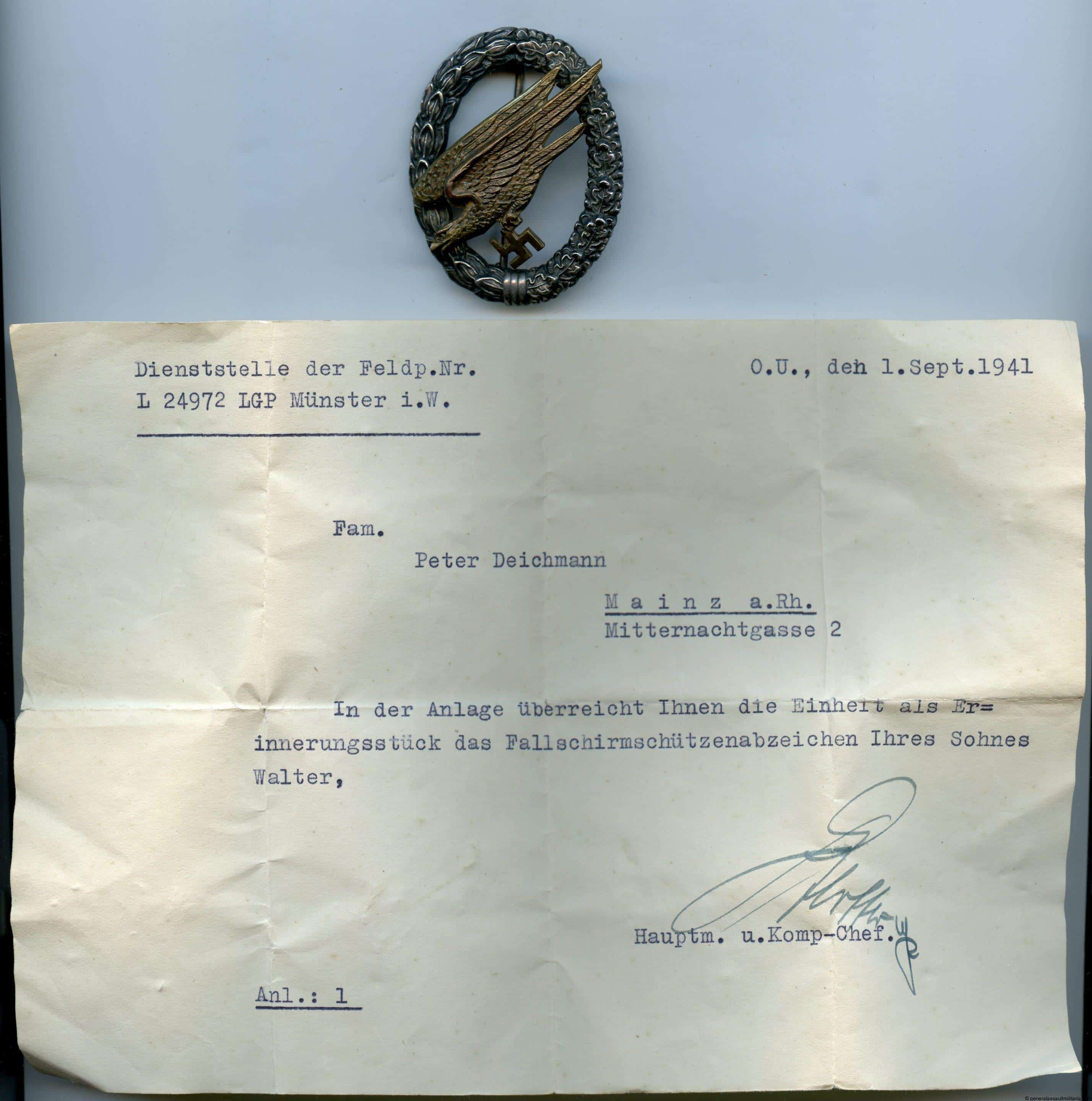 Luftwaffe paratrooper badge(Sturm Regiment Koch) – C.E. Juncker, Berlin. Early war tombac paratrooper badge with factory blackened D2 wreath and tombac gilded D2 eagle. Maker marked with the Juncker mark on the reverse of the eagle. Remains in good worn condition with well worn front and still perfect looking reverse. Comes with a letter from the 14. Kompanie Luftlande-Sturm-Regiment 1 (Koch) about the badge having been send back to the family as a souvenir to remember their son by. Very rare to have such a later especially relating to the FJ badge.