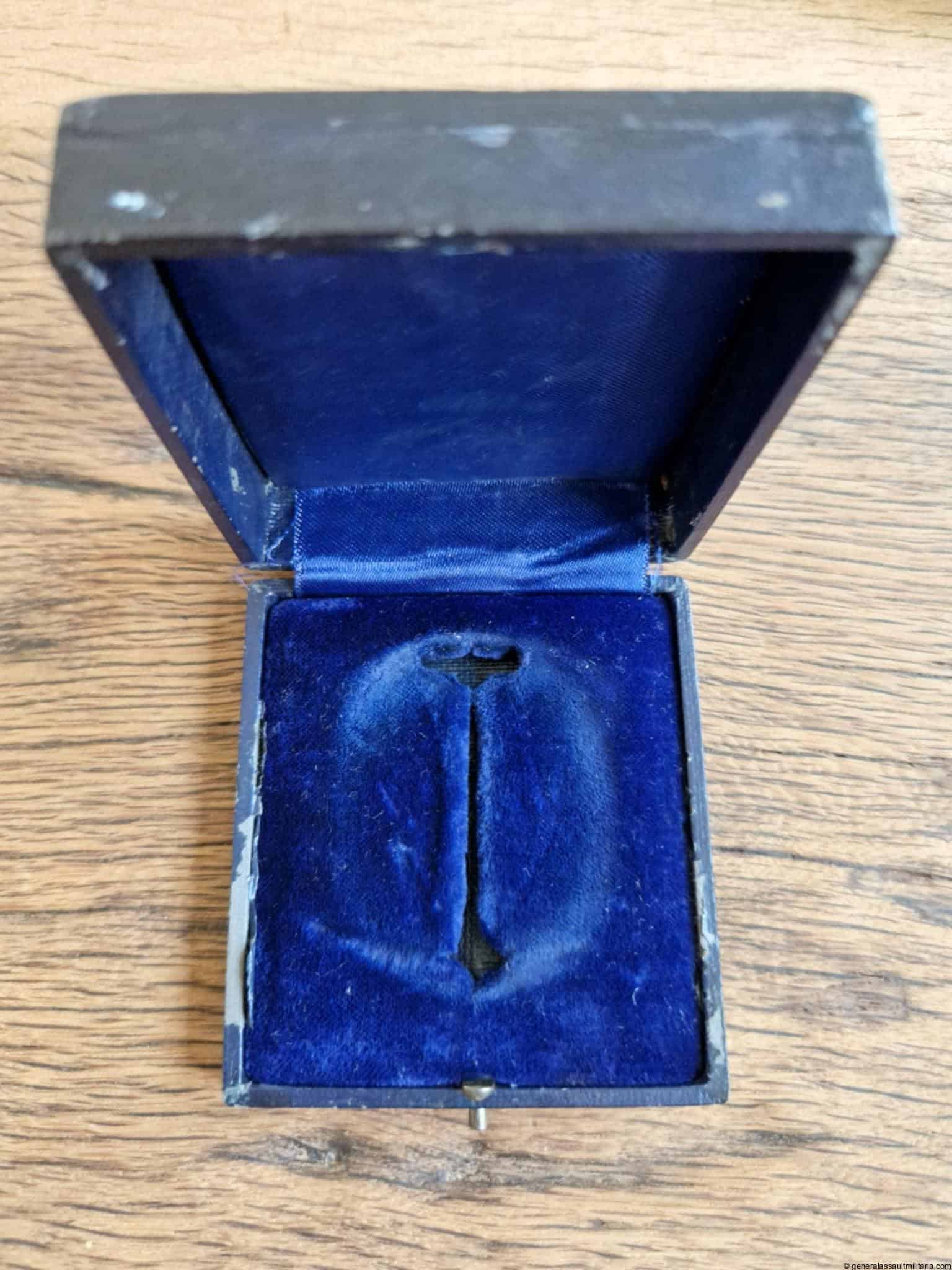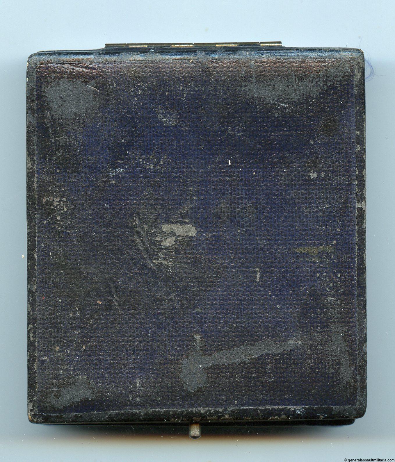 Luftwaffe pilot badge case (J2-J3). Early war case with soft inlay, mainly used for the Juncker J2 or J3 badges. Remains in good condition with some wear and fading of the color, but the gold lettering is still fully intact. Inside is clean and retained the color nicely. More uncommon early and sought after case.