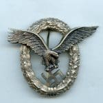 Luftwaffe pilots badge – Friedrich Linden, Lüdenscheid. Early tombac eagle and wreath with plated silver finish and blued eagle. Extremely good looking example with a very bright look and only light wear. Rivets are look perfect and are still tight. Beautiful FLL example that rarely appears this appealing.