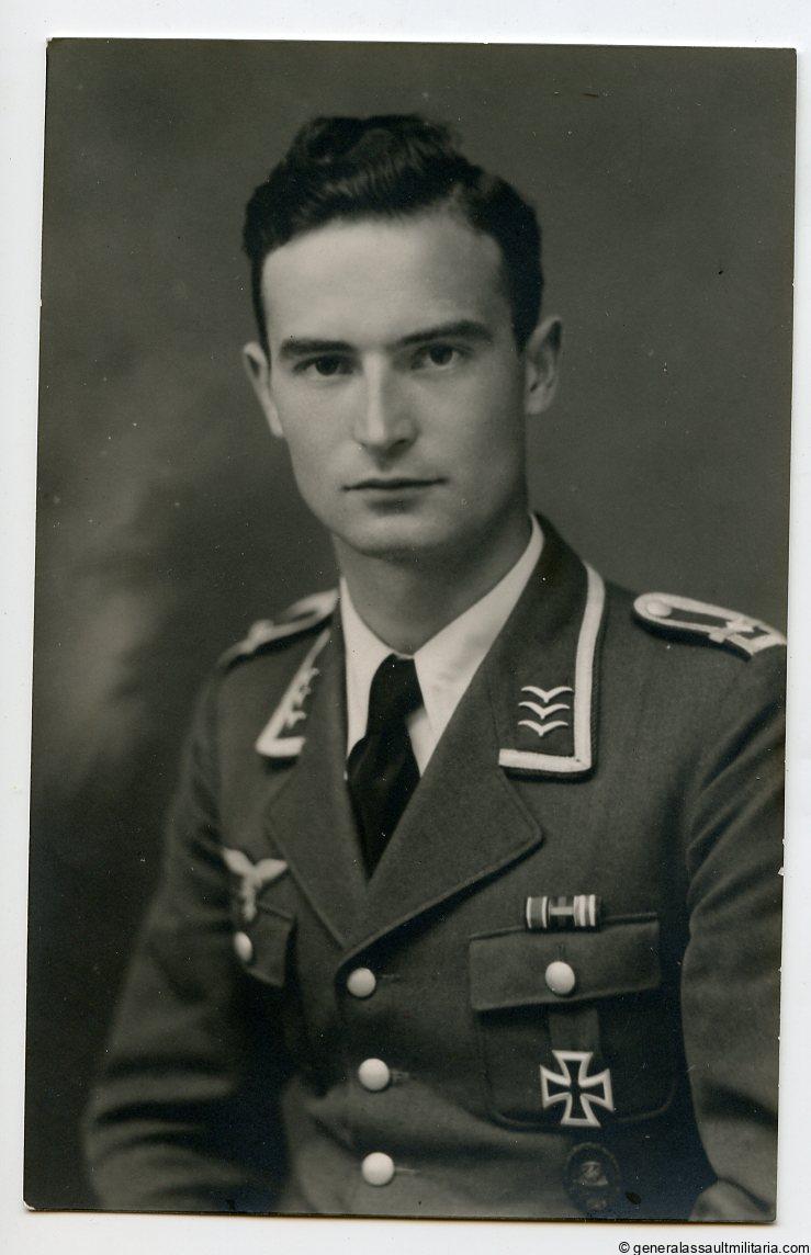 Luftwaffe portrait with Ek1, 1st pat. wound badge in black, Ek2 ribbon, Sudetenland ribbon and Afrika medal ribbon. Interesting combination of awards, postcard size, on Echte Photographie portrait paper.