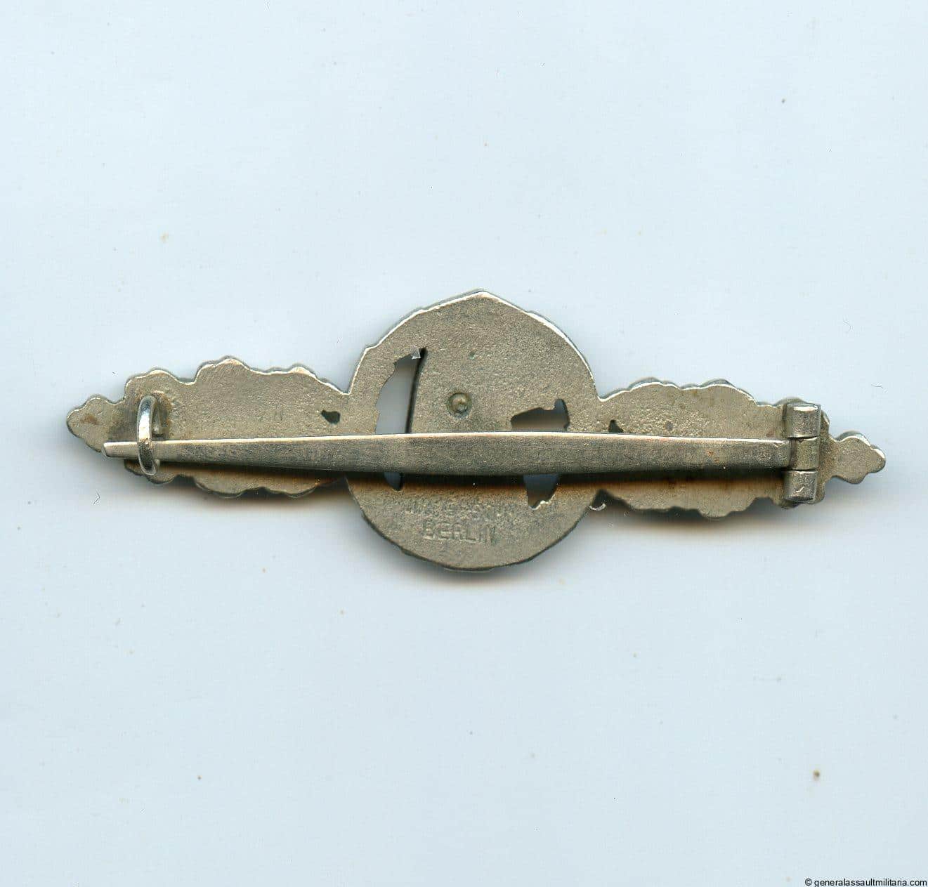 Luftwaffe recon clasp in silver – IMME & Sohn, Berlin. Early war solid nickel silver clasp with nickel silver riveted eagle head. Remains in lightly worn condition and never had any burnishing applied to the eagle in typical IMME fashion. The reverse is marked with rare full IMME makers mark. Top ‘Frontflugspange für Aufklärer in Silber’