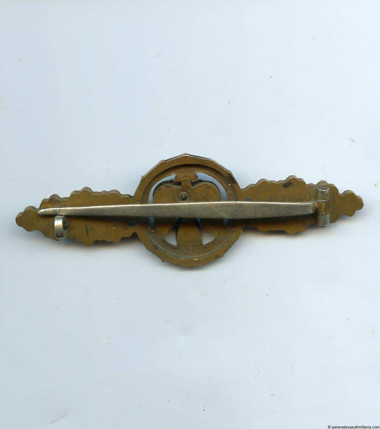 Luftwaffe short range night fighter clasp in bronze – C.E. Juncker, Berlin. Early war tombac ‘Nah-Nachtjäger Frontflugspange’ with Juncker design and flat wire catch. Remains in worn condition with most of the bronze finish still on the clasp and some of the black lacquer on the wreath worn down. The riveted arrow device retained most of the burnishing. Very uncommon short range night fighter clasp.