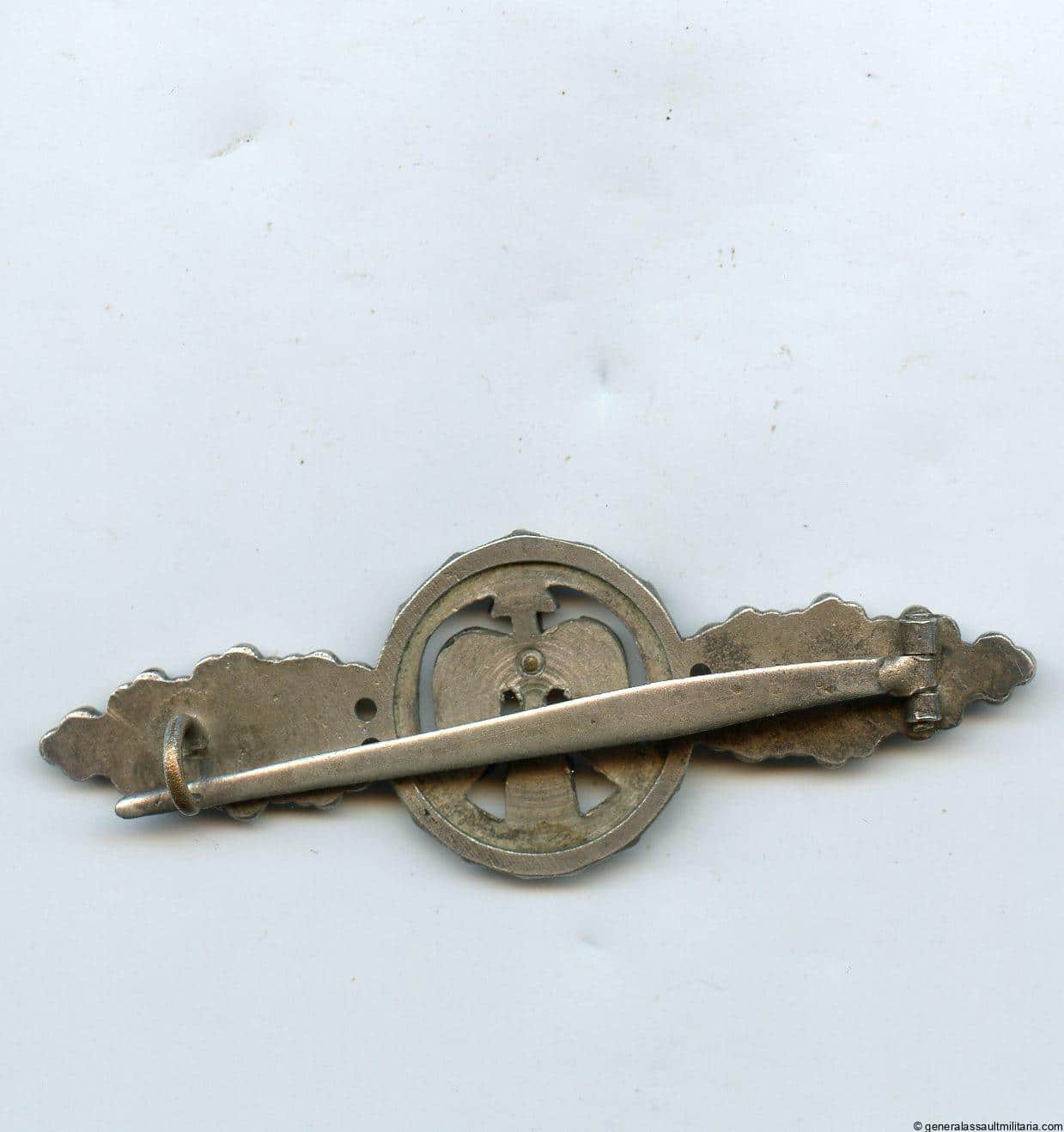 Luftwaffe short range night fighter clasp in silver – C.E. Juncker, Berlin. Early war nickel silver ‘Nah-Nachtjäger Frontflugspange’ with Juncker design and riveted burnished arrow. Remains in worn condition with most of the silver frosting still intact on the lower parts of the leaves, the arrow has most of the burnishing worn down. The hand finished wreath shows about 2/3 of the fragile black finish remaining. Very appealing clasp with a natural untouched look to it. Very difficult to find early clasp!