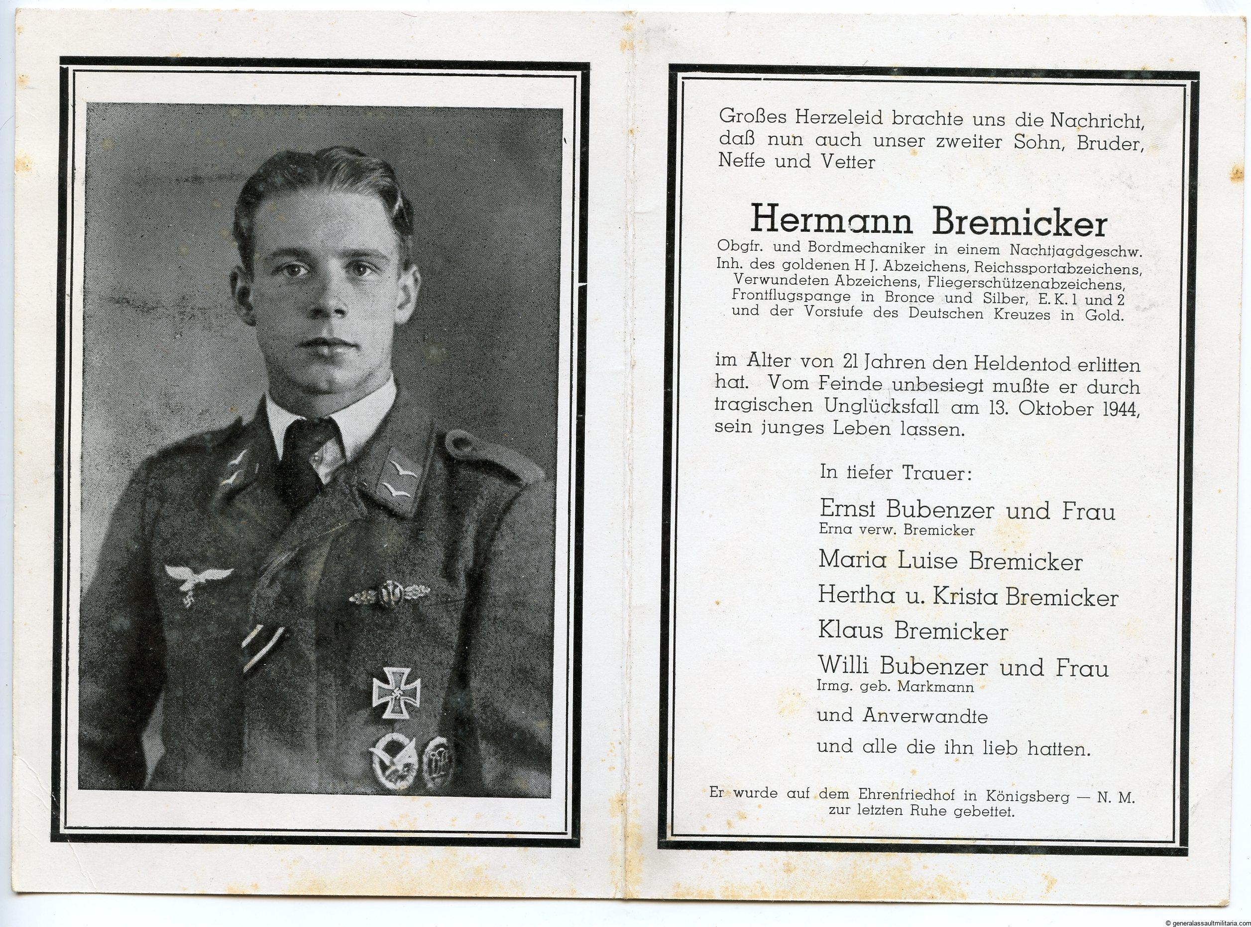 Nachtjagdgeschwader 3 Death notice – large size. A5 size ‘Sterbebild’ on thick paper and with large portrait on the inside. Shows Hermann Bremicker who died on the 13th Okt 1944 after a flight accident. Bremicker was a well decorated flight mechanic with the Long range night fighter clasp in silver, which can also be seen in wear on his uniform. The Card mention the DKIG, however it is difficult to say if he was indeed awarded the german cross in gold. Very rare in this high quality and large size especially with the night fighter clasps.