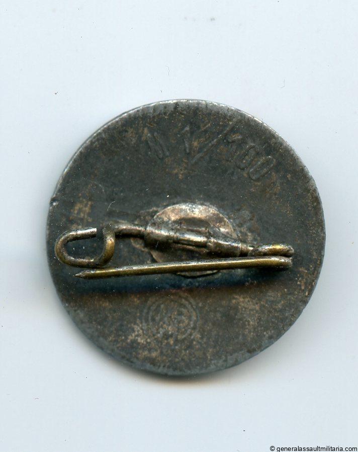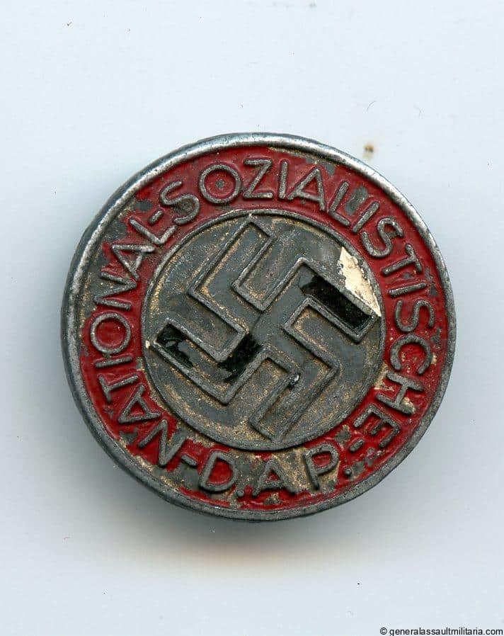 NSDAP party badge – RZM M1/100 Werner Redo, Saarlautern. Mid to late war zinc badge with painted surface. Remains in well used condition with some scratches on the front and a good part of the paint and silver finish missing. Later production by W.R. when painting these became less time consuming.
