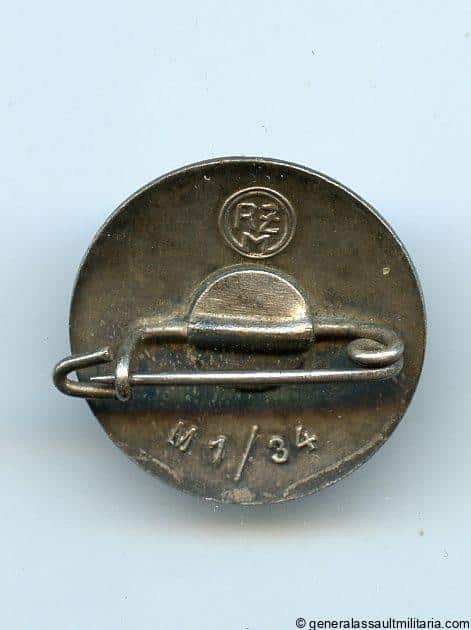 NSDAP party badge – RZM M1/34 Karl Wurster, Markneukirchen. Early RZM example in tombac with silver plated finish and enamel inlay. Remains in excellent and only very lightly worn condition. Maker marked with the Wurster RZM M1/34 logo on the reverse.