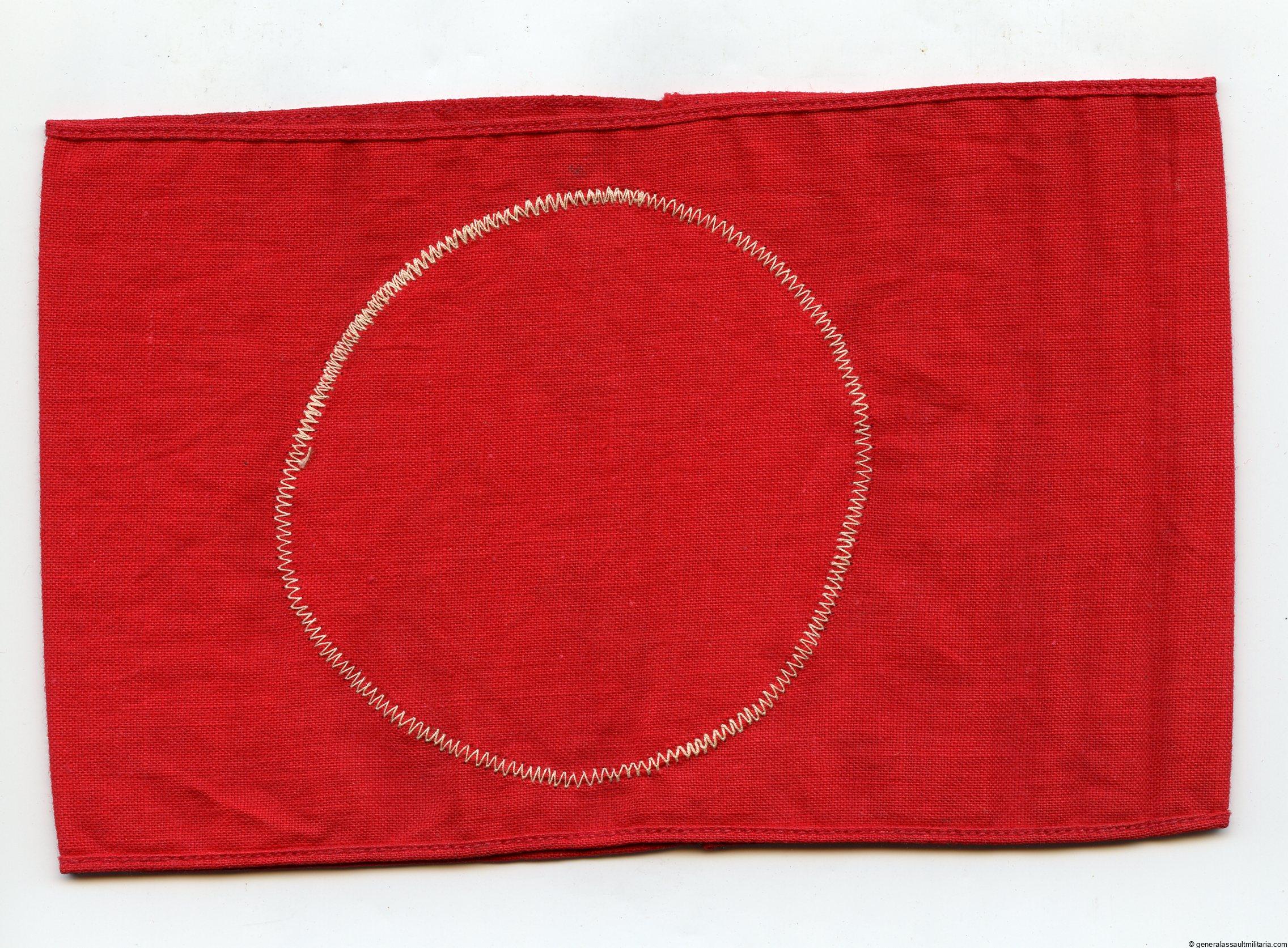 NSDAP political armband with SA stamp. Cloth political NSDAP armband with white stitched roundel and woven swastika. Small size and comes with a red SA eagle stamp which is quite hard to read. The band remains in good condition with normal wear and no heavy staining. Perfect example as a collectible variant or for a uniform.
