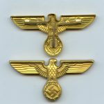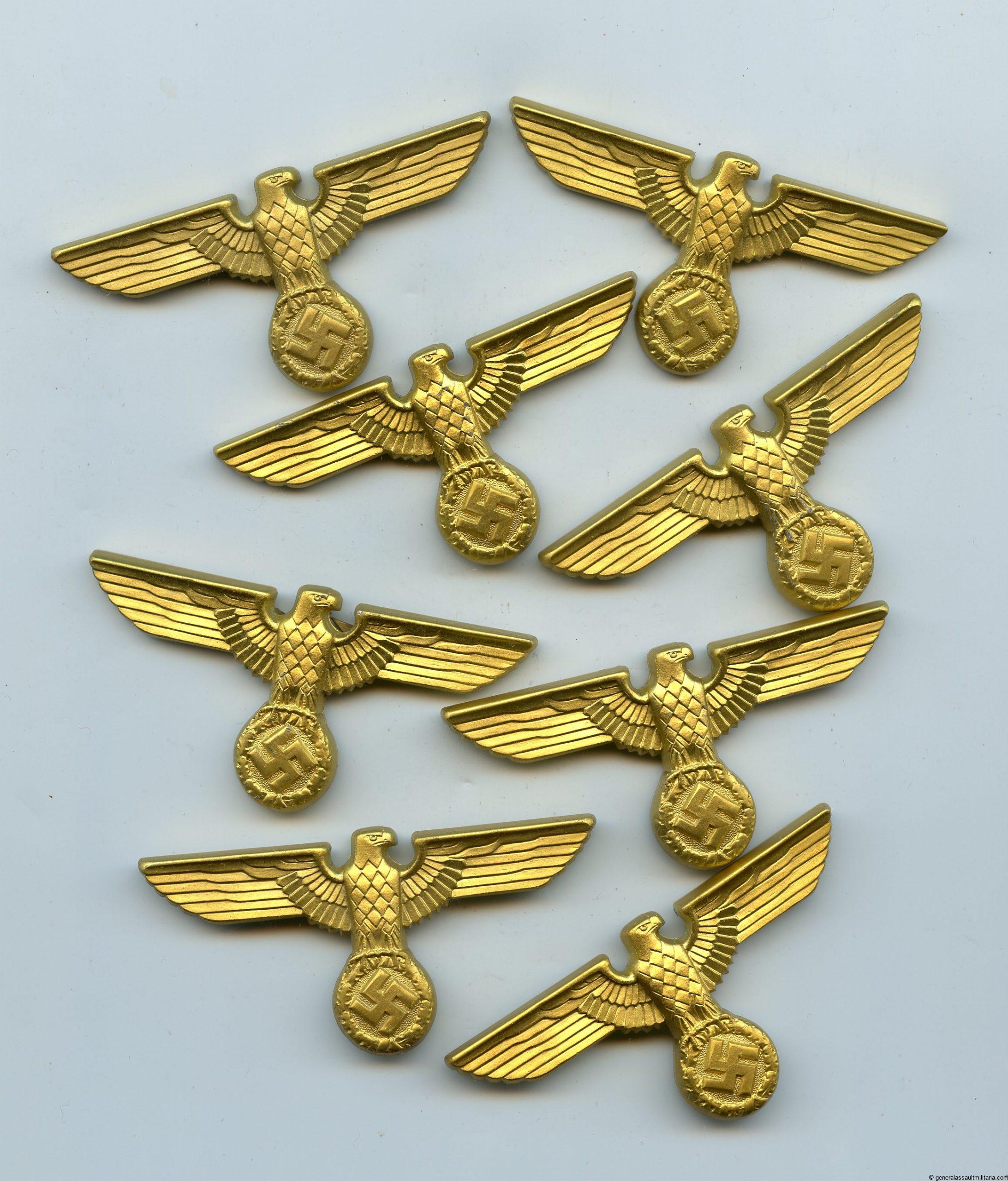 NSDAP political cap eagle – RZM M1/44 C. Dinsel, Berlin. Aluminum cap eagle with crimped in prongs and gilding on top. ALl examples remain in unworn condition with some minor scratches on some from being poorly stored over the years. Left over stock examples picked up after the war.
