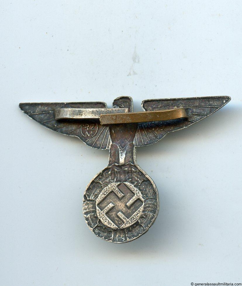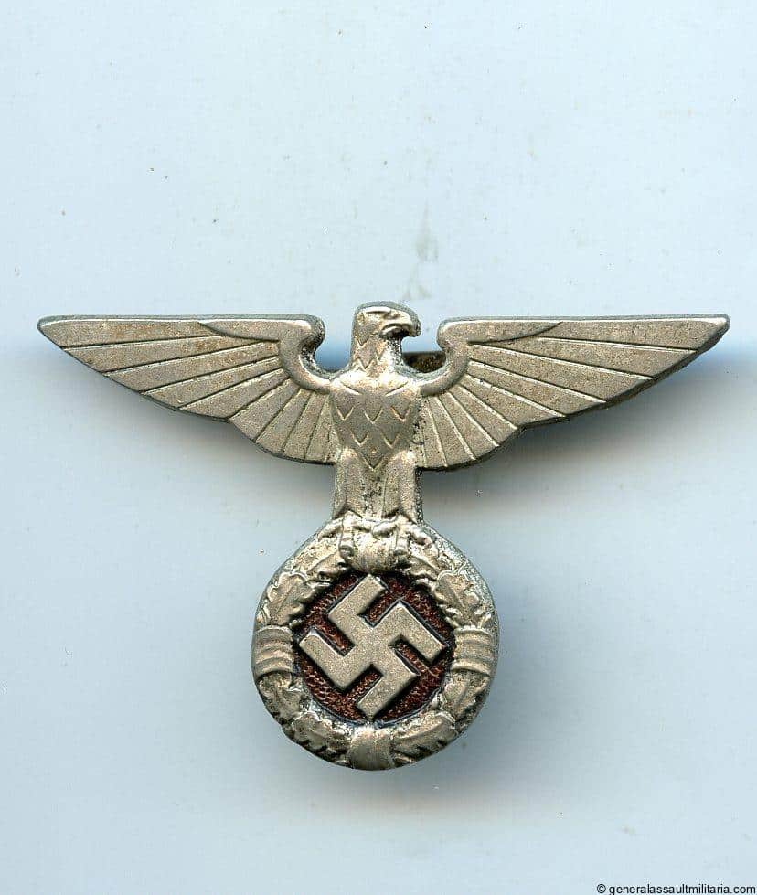 NSDAP/SA/SS large cap eagle – RZM 52. 1934-1935 RZM M/52 Deschler marked cap eagle. Tombac/nickel silver silver plated construction with black finished back of the swastika. Remains in very good lightly worn to unworn condition with the RZM mark nicely presented and both the thick prongs fully intact. One of the best looking political eagles that was often used on the SS cap.