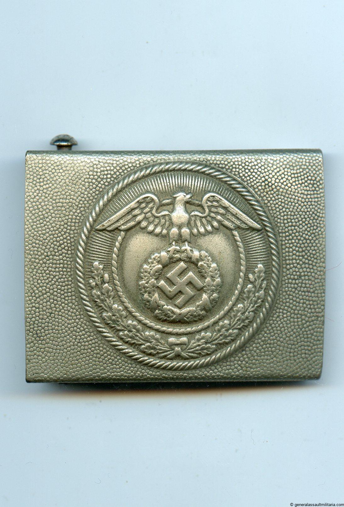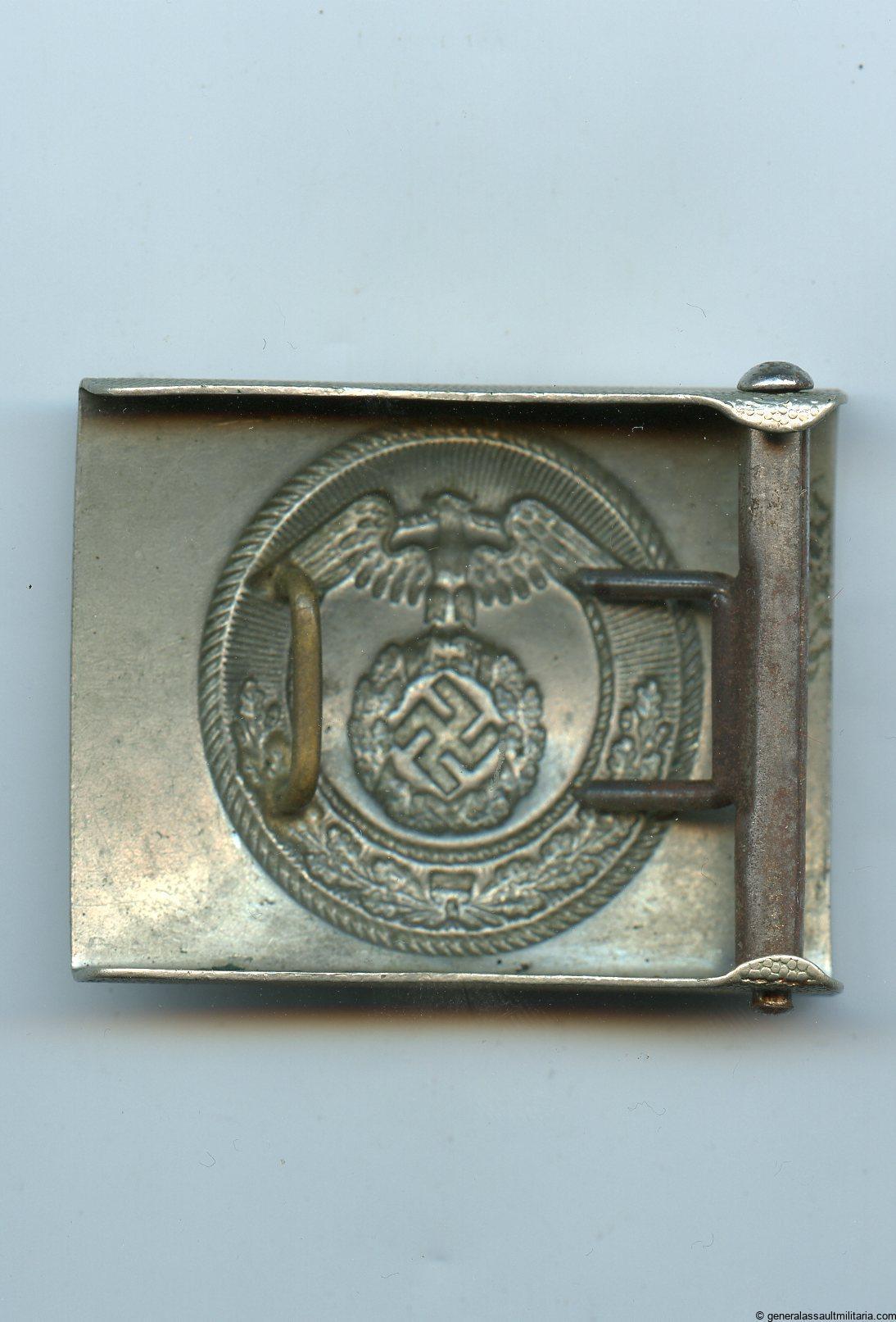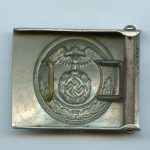 NSKK buckle – Unknown maker. Early nickel silver buckle with brass catch and still fully functional prongs. Remains in worn condition and shows some wear to the eagle. Quality buckle that is more uncommon to find. Good looking NSKK buckle variant.