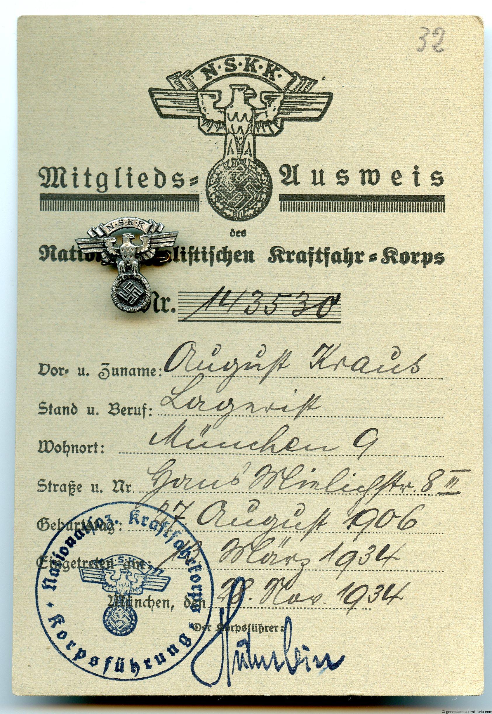 NSKK membership ID with RZM M1/76 membership badge. NSKK membership ID card with all the information filled and remains in very good condition with no damage or staining. The zinc NSKK badges has a crimped setup device and RZM M1/76 for Hillenbrand & Bröer, Lüdenscheid.