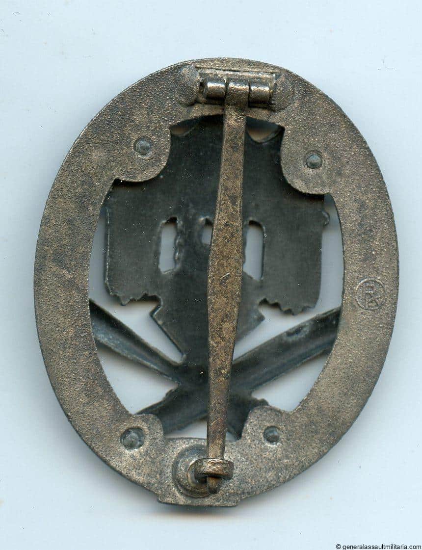Numbered general assault badge 50 – Rudolf Karneth, Gablonz. Mid to late war zinc RK marked ‘Allgemeines Sturmabzeichen mit Einsatzzahl 50’. Remains in unworn condition and has most of the finish remaining on the wreath. The riveted eagle remains tight and has fairly bright appearance. The numbers box lost the bronze finish as is normally the case with the Gablonz made badges. Catch is still tightly crimped and doesn`t move. Difficult to find 50 GAB.