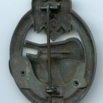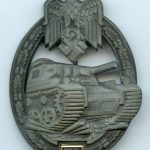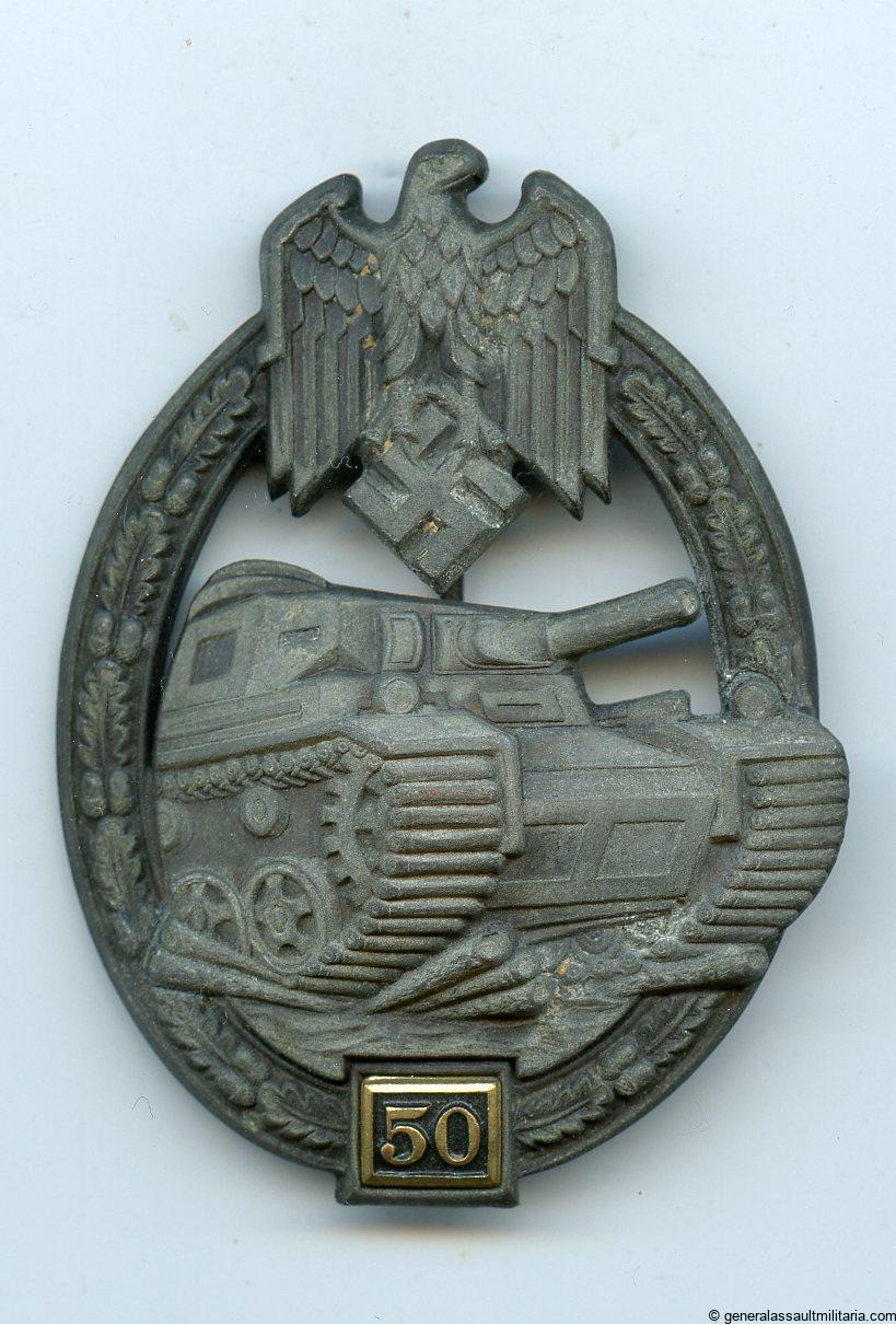 Numbered panzer assault badge 50 in bronze – Gustav Brehmer, Markneukirchen. Late war zinc ‘Panzerkampfabzeichen mit Einsatzzahl 50 in bronze’ with riveted zinc tank and bronze tone finish. Appears to be lightly faded condition and shows some los of finish on the front. The back is remains in textbook condition with oval hinge setup and typical marks on the pin. The brass/tombac numbers box was attached with a split pin, Brehmer their last variation. Extremely uncommon to find a Brehmer in brons, only so few soldiers officially received a bronze 50 PAB.