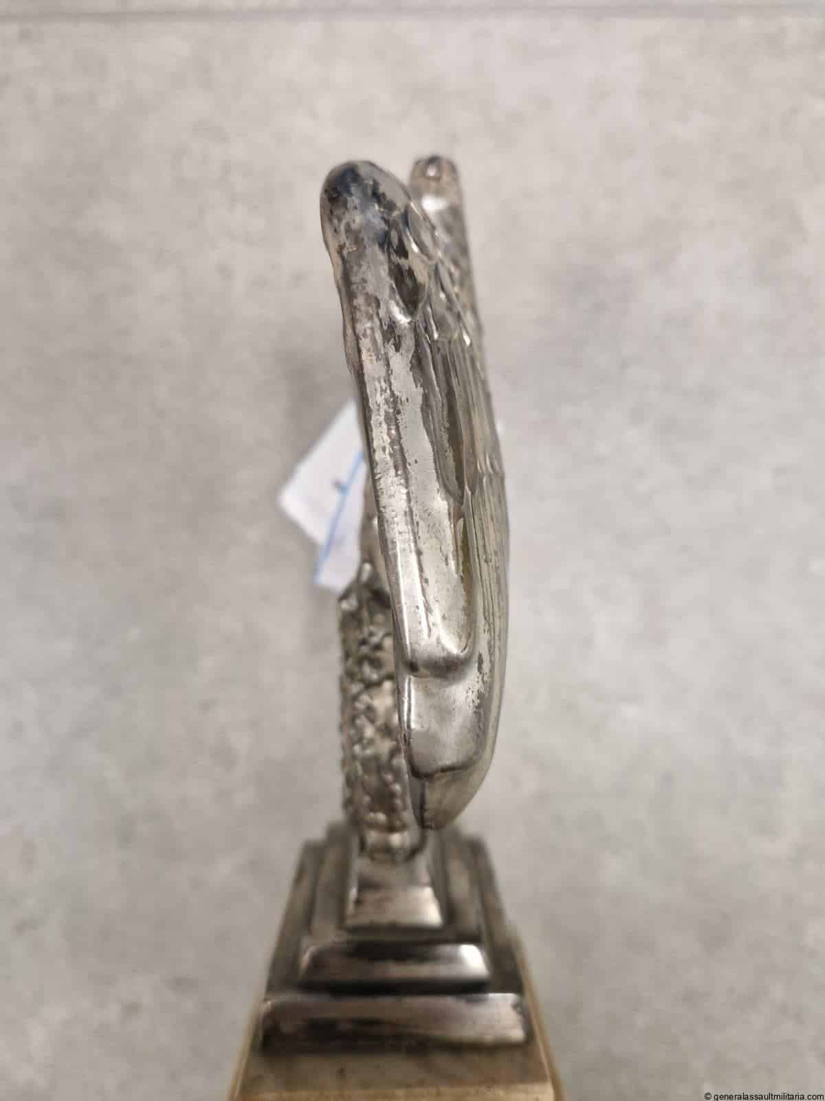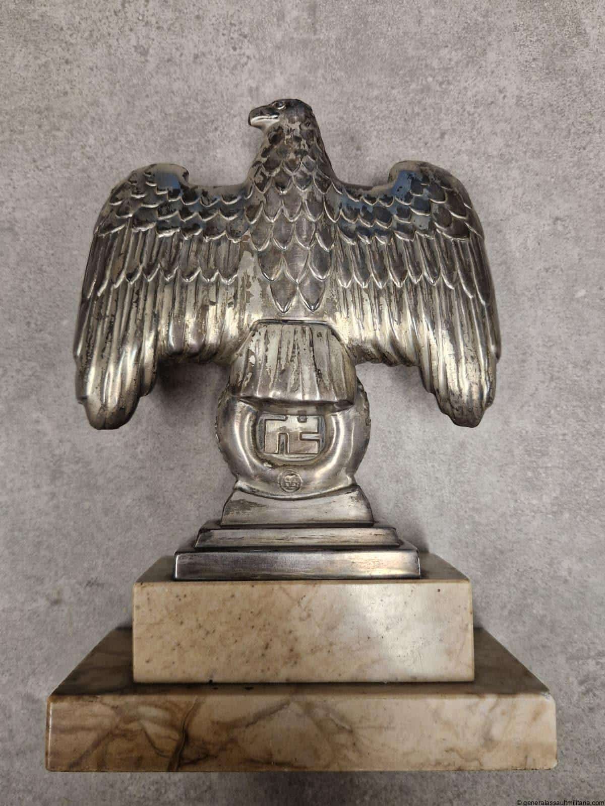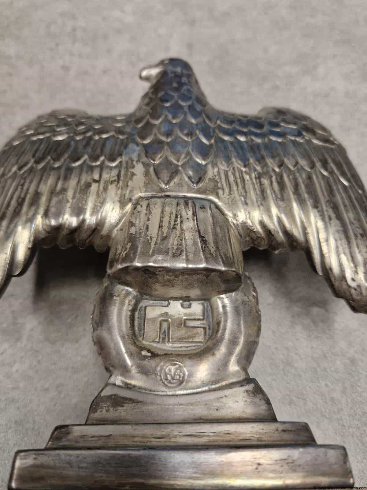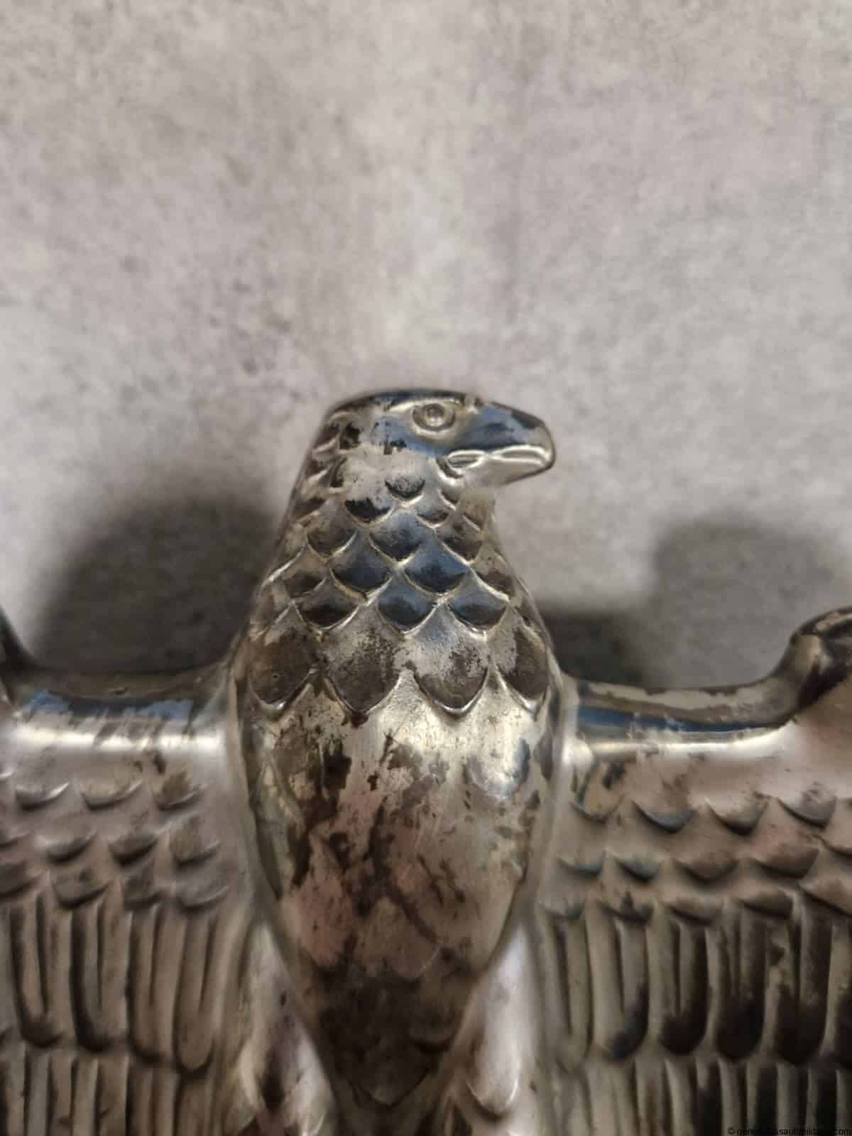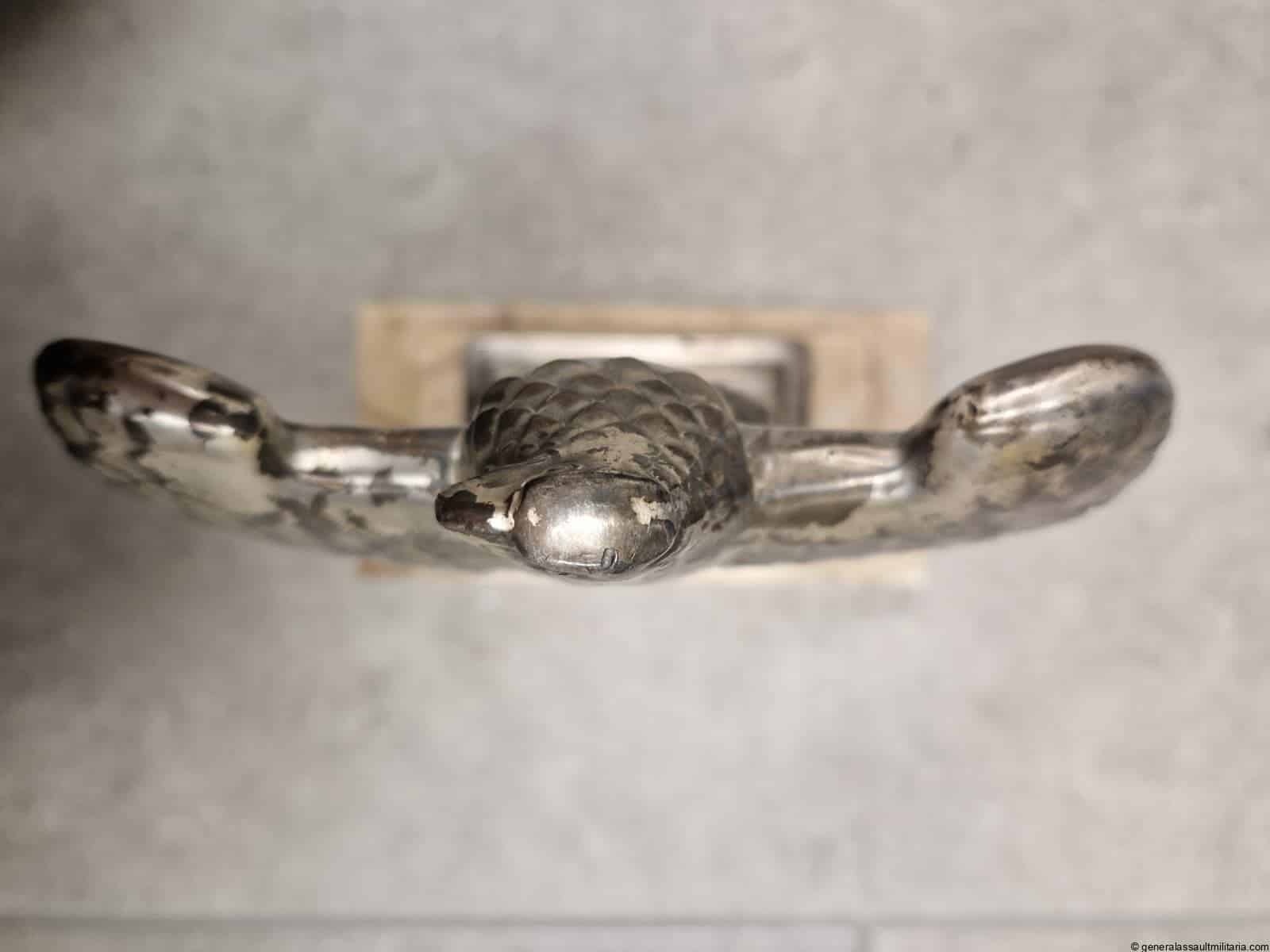 Nürnberg eagle – H.H. Beusekom 17cm. Highly sought after Nürnberg desk eagle in stunning condition with silver finish, HB makers mark and feathered back on the reverse. Comes with the original base with both screws untouched and nicely oxidized. Has a high two layer marble base and stands 17cm tall without the base. Only shows minimal wear and has a great appealing look to it. Premium eagle.