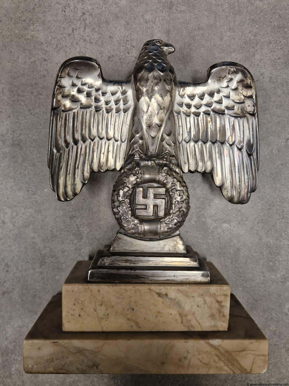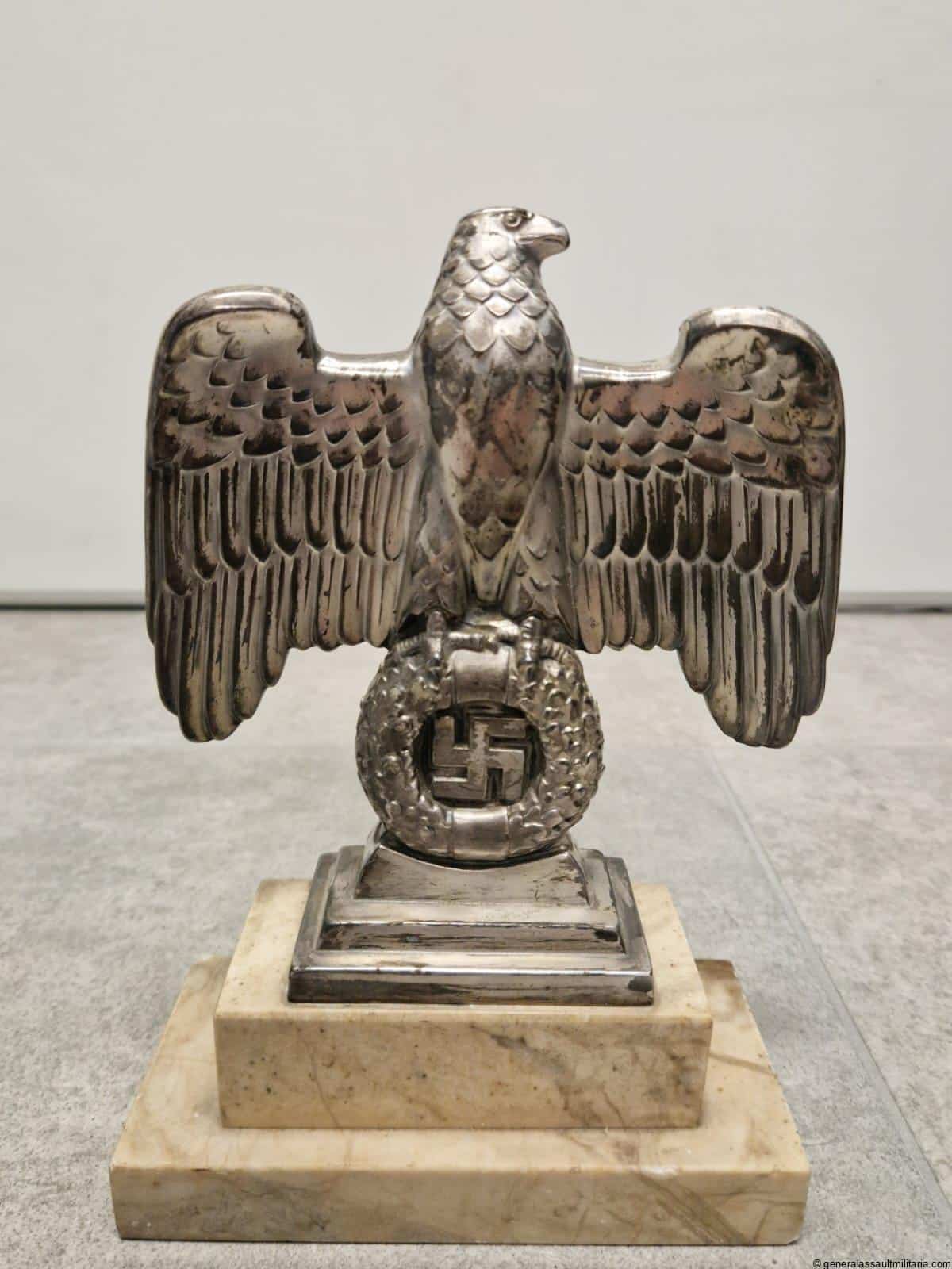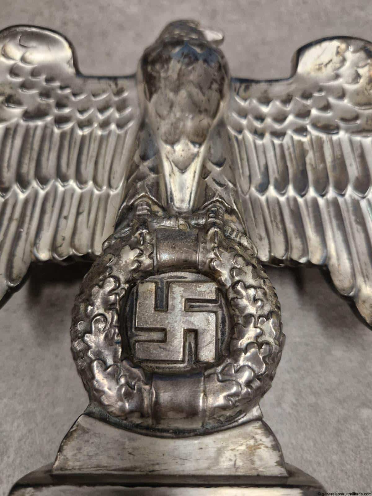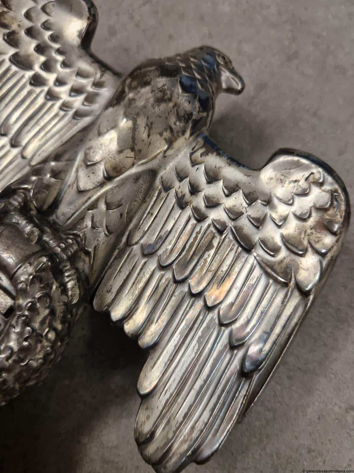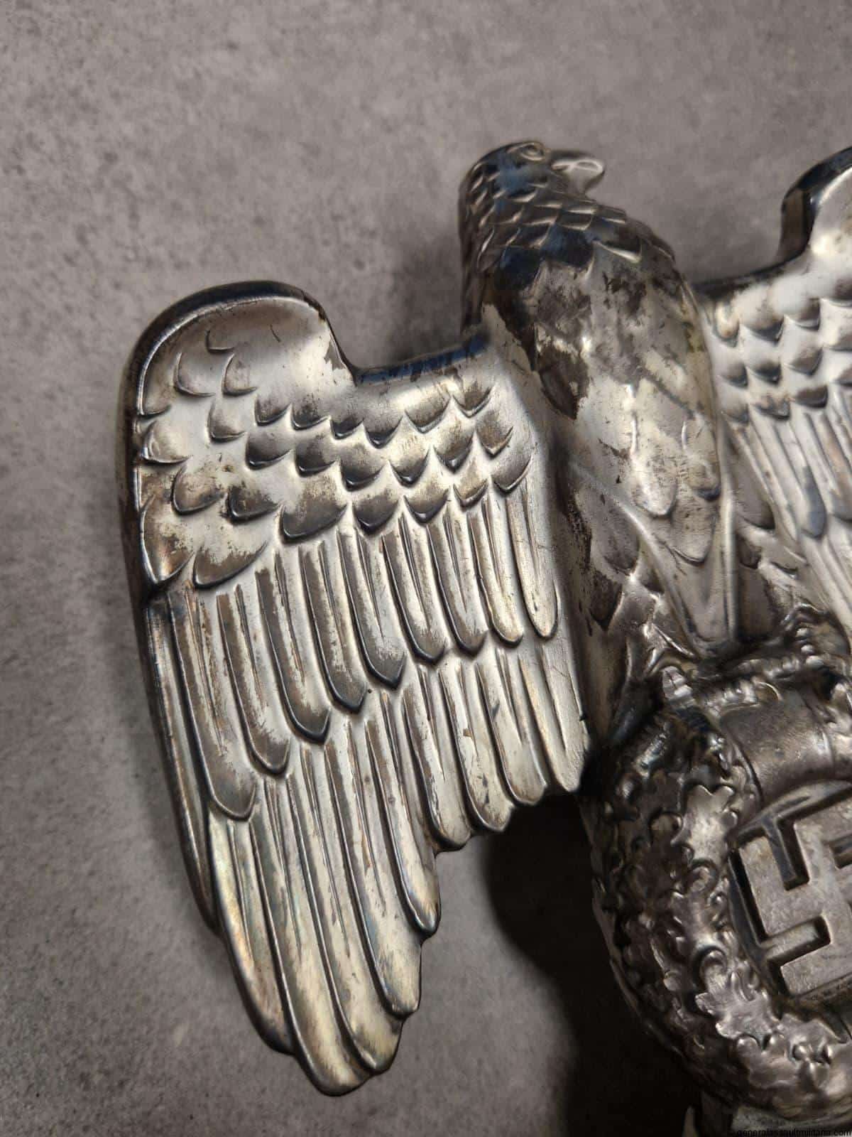 Nürnberg eagle – H.H. Beusekom 17cm. Highly sought after Nürnberg desk eagle in stunning condition with silver finish, HB makers mark and feathered back on the reverse. Comes with the original base with both screws untouched and nicely oxidized. Has a high two layer marble base and stands 17cm tall without the base. Only shows minimal wear and has a great appealing look to it. Premium eagle.