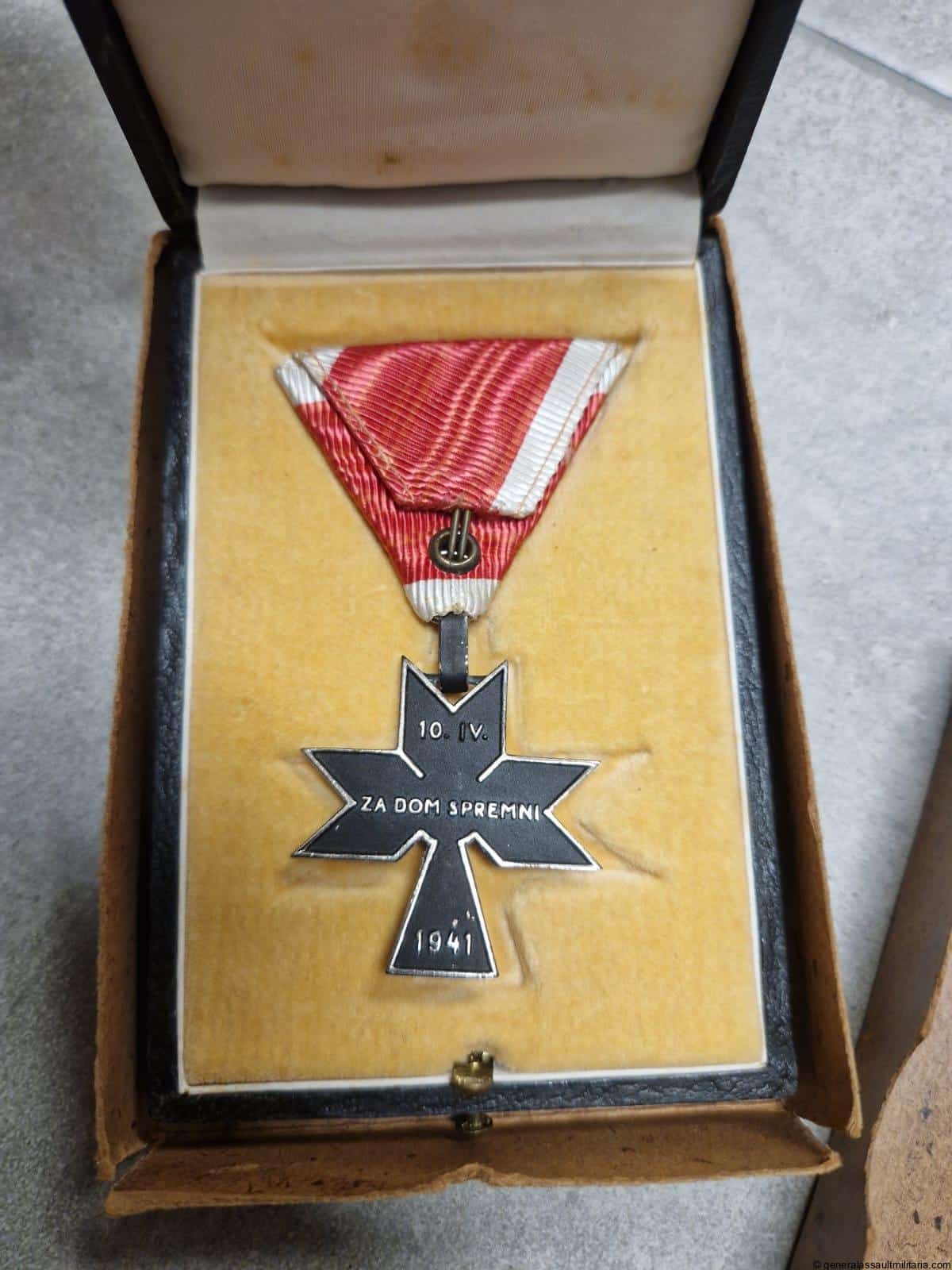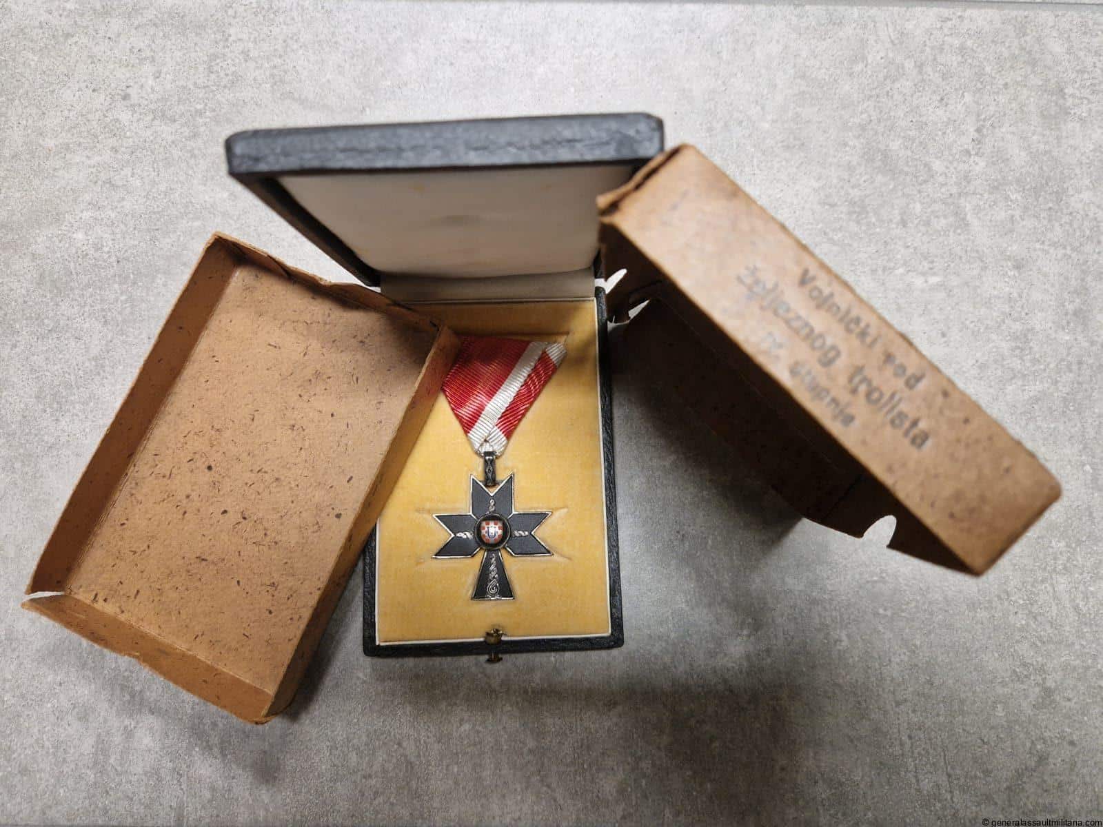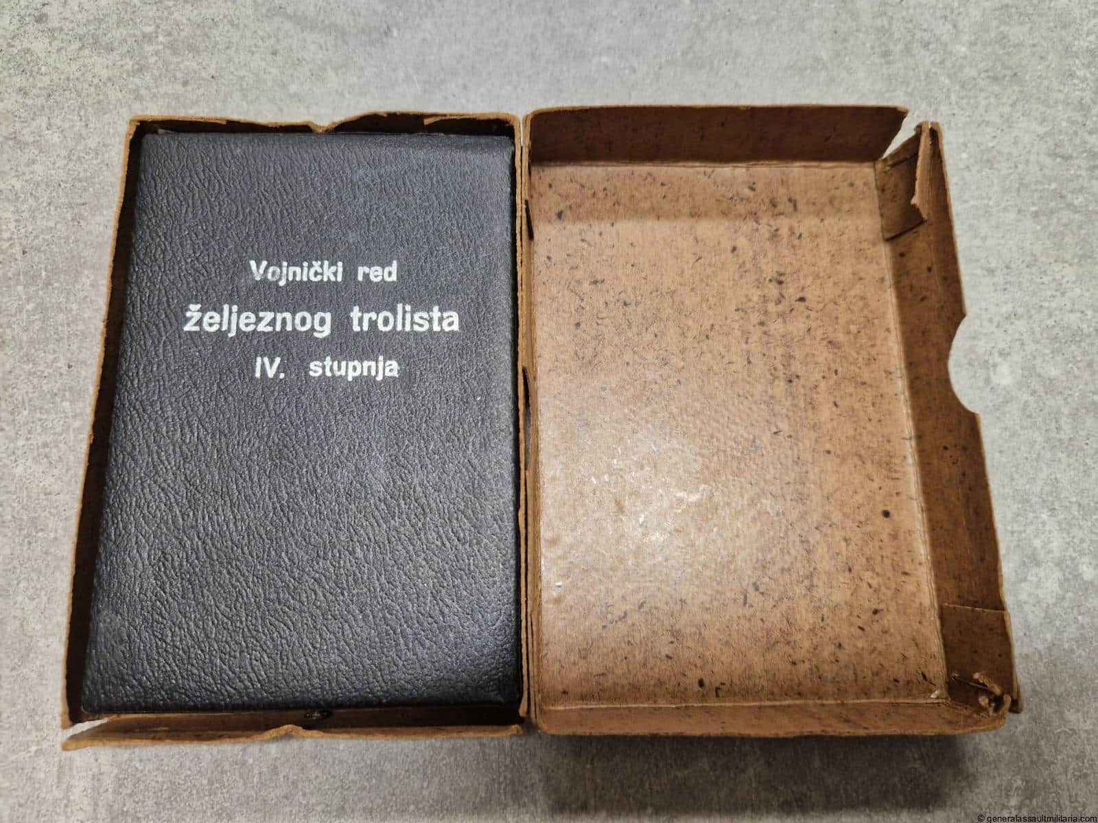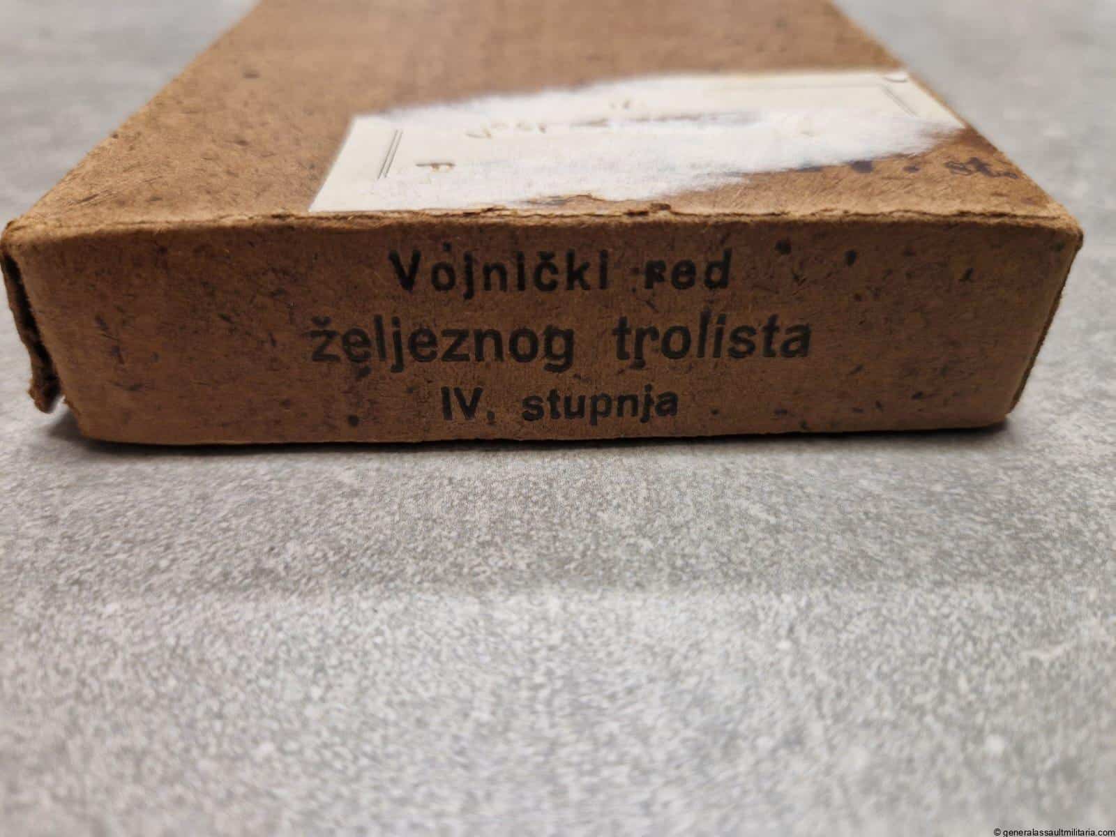 Order of the Iron Trefoil IV Class + case & carton. Very uncommon WWII period ‘Red željeznog trolista IV Stupnja’ in perfect mint condition with all the black finish and enamel inlay on the attached Croation shield. Made from a silver looking alloy and with black mat finish on top. Has the original triangle vaulted ribbon present. Comes with the matching case in equally fine condition still packed in the extremely rare original carton with the name of the award on the front. The name of the recipient seems to have been present on the front but was scratches of the sticker. Absolute rarity as a complete set!