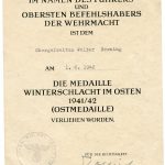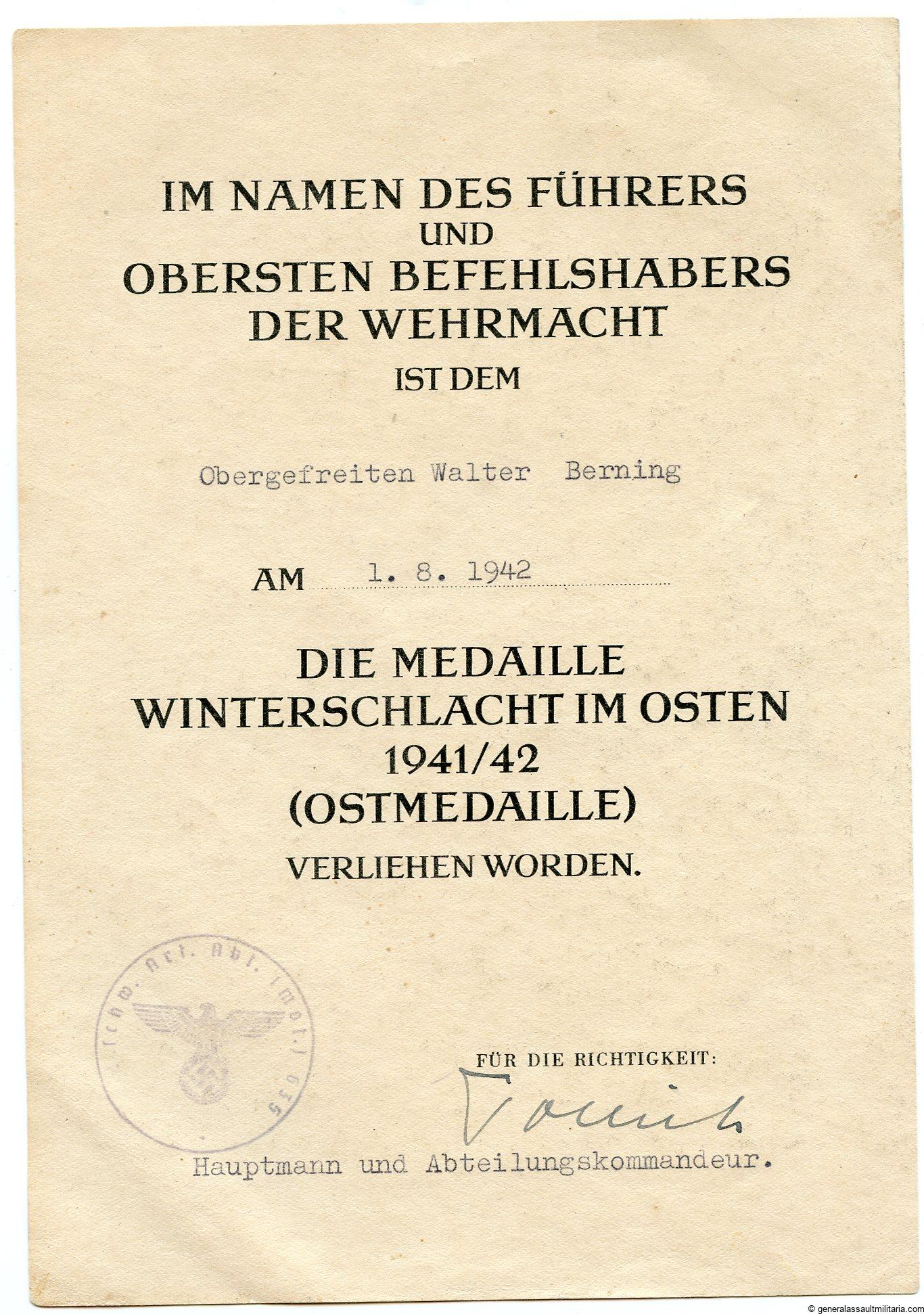 Ost medal award document to Obergefreiten Walter Berning 1.8.1942. Stamped at the bottom with the Schw. Art. Abt. (mot.) 635 unit stamp. Remains in very good condition and shows no damaged over vault lines. Top condition Ost medal document to a motorized heavy artillery unit(635).