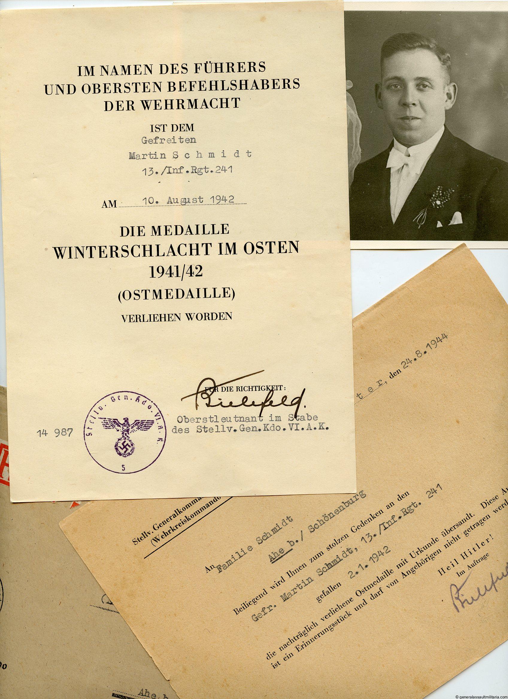 Ost medal certificate with KIA papers in original letter. Interesting Ost medal award document variant to Martin Schmidt Infanterie Regiment 241, KIA 2.1.1942. comes with a portrait of Martin and his wife with names and dates on the reverse but most likely printed post war. Everything comes in the original letter it was sent in.